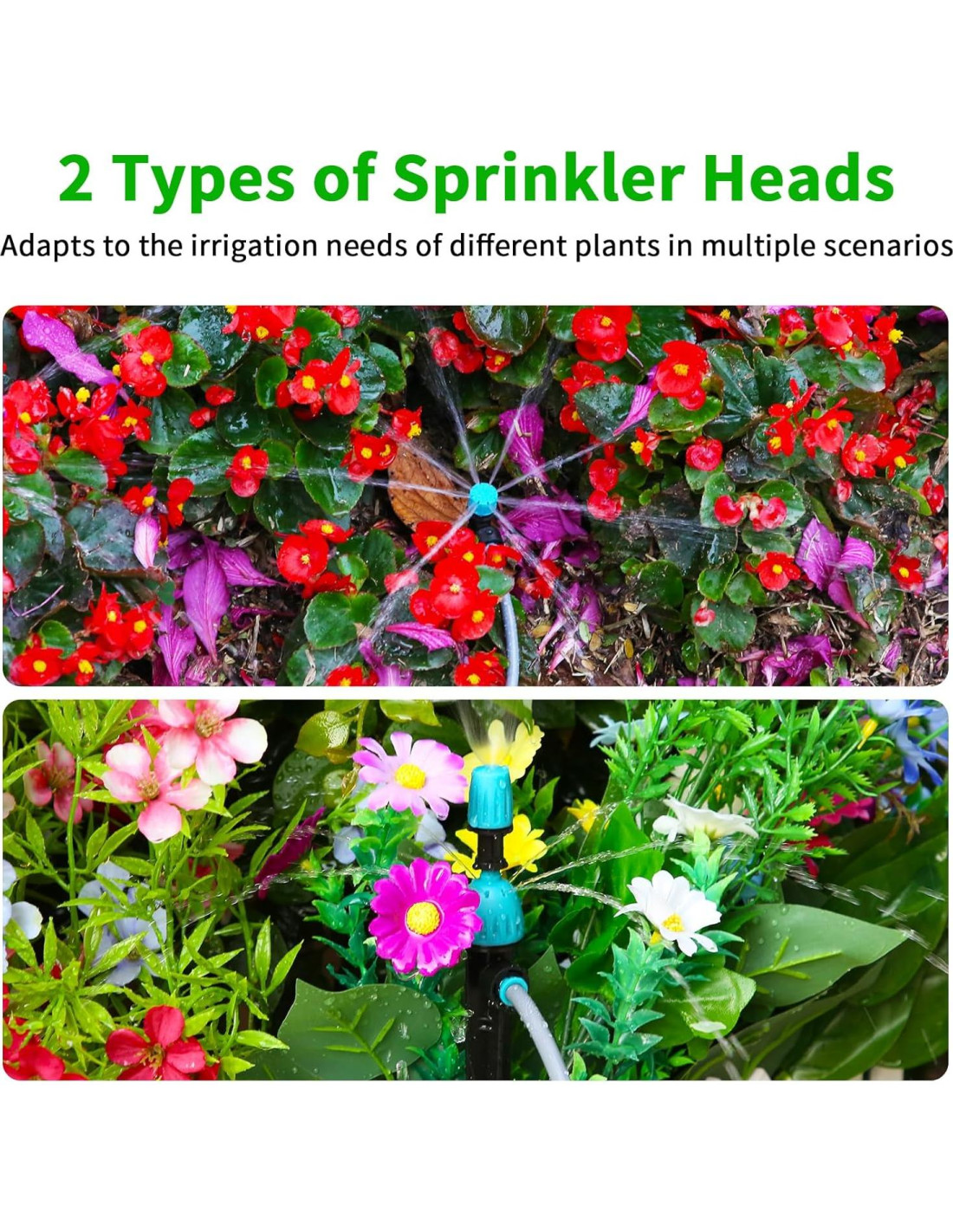 - [2 tipos de cabezales de goteo] Este kit de accesorios del sistema de riego viene con dos tipos de cabezales de goteo: un cabezal de rociador de 8 agujeros en el suelo y un gotero de riego por spray, donde la parte superior del cabezal de rociador de goteo también se puede girar para producir salpicaduras de diferentes tamaños para satisfacer una variedad de necesidades de riego de plantas.