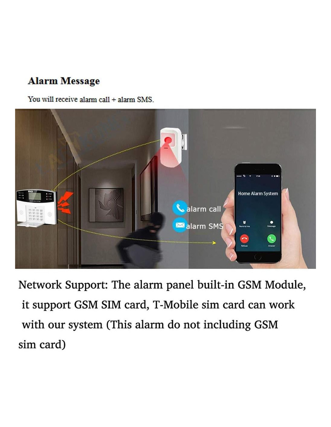- Soporte de Red: El panel de alarma tiene un módulo GSM incorporado, admite tarjeta SIM GSM, la tarjeta SIM de T-Mobile puede funcionar con nuestro sistema (esta alarma no incluye tarjeta SIM GSM). Cuando se activa el sensor, el panel de alarma realizará una llamada o enviará un mensaje de alerta al número de teléfono de alerta que configuró anteriormente. La frecuencia GSM (solo) es 850/900/1800/1900MHZ, que se puede aplicar en todo el mundo; En estado GSM, puede configurar 6 grupos de números de teléfono de alerta y 2 grupos de números de SMS de ayuda
