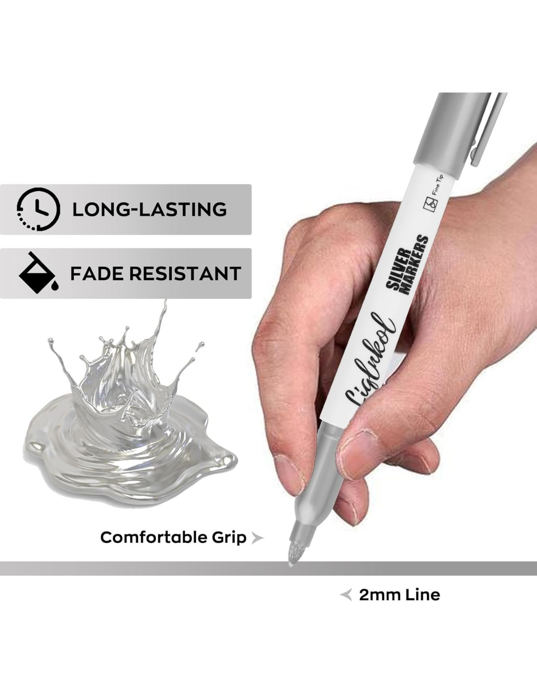 - Escritura suave y secado rápido: Marcador metálico plateado de secado rápido, opaco y a prueba de decoloración con tinta pigmentada de secado rápido que no se desvanecerá. Marca fácilmente superficies claras y oscuras con el acabado metálico brillante y altamente visible de estos marcadores plateados.