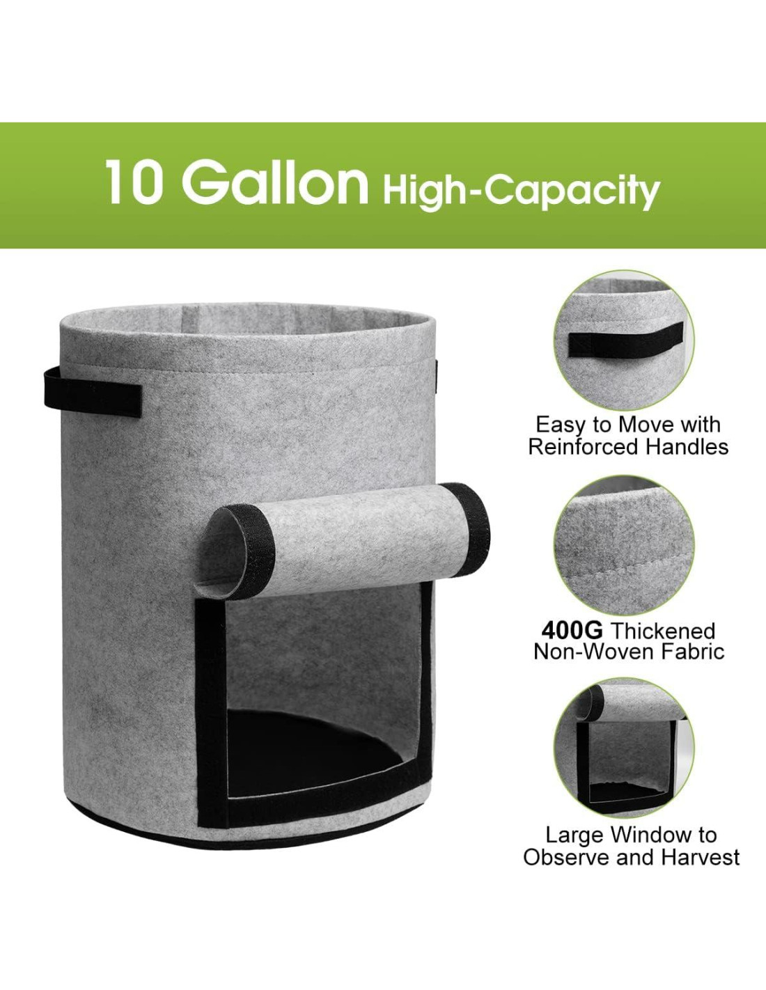 - Diseño Conveniente: Estas bolsas de cultivo de papas vienen con una gran ventana de cosecha, a través de la cual puedes revisar tu planta y cosechar verduras fácilmente. Estas bolsas de cultivo están hechas de material resistente para asegurar que puedas mover las bolsas llenas de tierra.