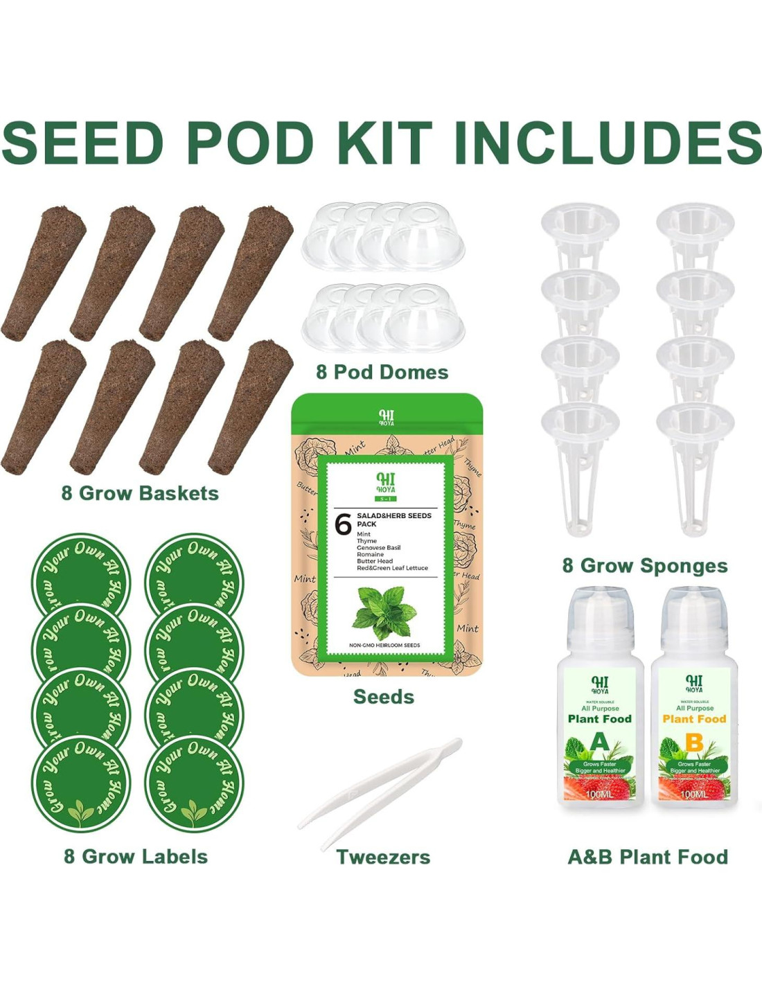 - Un kit para todas sus necesidades: Este kit de cápsulas de semillas para cultivar cualquier cosa es un conjunto de recarga integral, perfecto para usar en cualquier sistema de jardín interior. Las cápsulas de semillas hidropónicas incluyen 8 esponjas de cultivo, 8 etiquetas de cápsulas, 8 cestas de cultivo, 8 domos de cultivo, 1 pinzas, alimento para plantas A&B y 6 tipos de semillas