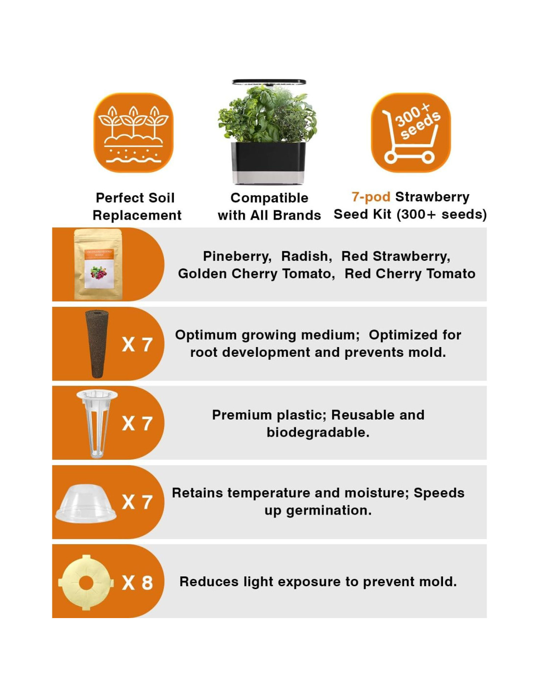 - [Todo lo que necesitarás] Este kit de cápsulas de semillas de fresa viene con todo lo que necesitarás para tu jardín hidropónico: 5 tipos de semillas hidropónicas de fresa (fresa roja, rábano, piña, tomate cherry rojo herencia, tomate cherry cosecha dorada), 7 esponjas de cultivo, 7 domos de cultivo, 7 cestas de plantación, 7 etiquetas de cápsulas y nutrientes A&B para plantas. Consigue este kit y obtén cosechas infinitas.