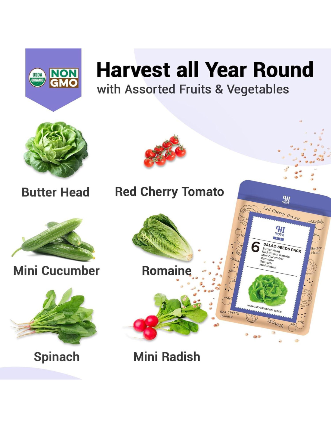 - Semillas No-GMO de Herencia: El paquete de semillas en el kit de inicio de jardín contiene aproximadamente 600 semillas de ensalada fáciles de cultivar, incluyendo Lechuga Mantequilla, Tomate Cherry Rojo, Mini Pepino, Romaine, Espinaca y Mini Rábano. Cultivar tus propias verduras para comer nunca ha sido tan fácil