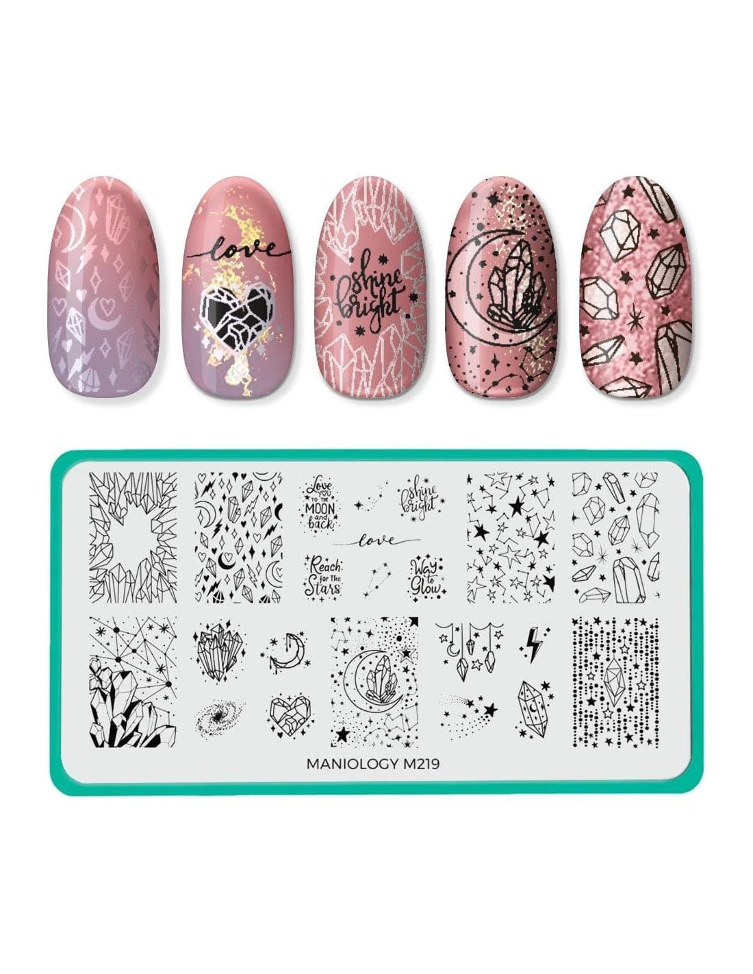 - Nuestra placa de estampado de uñas Galaxia Cristal (m219) te lleva a un viaje cósmico con estrellas, lunas, expresiones y más. Estampa toda la noche con 7 diseños de uñas completas y 15 estilos de acento. Crea manicuras rápidas y fáciles con un simple estampado o estampado inverso para aún más dimensión.
