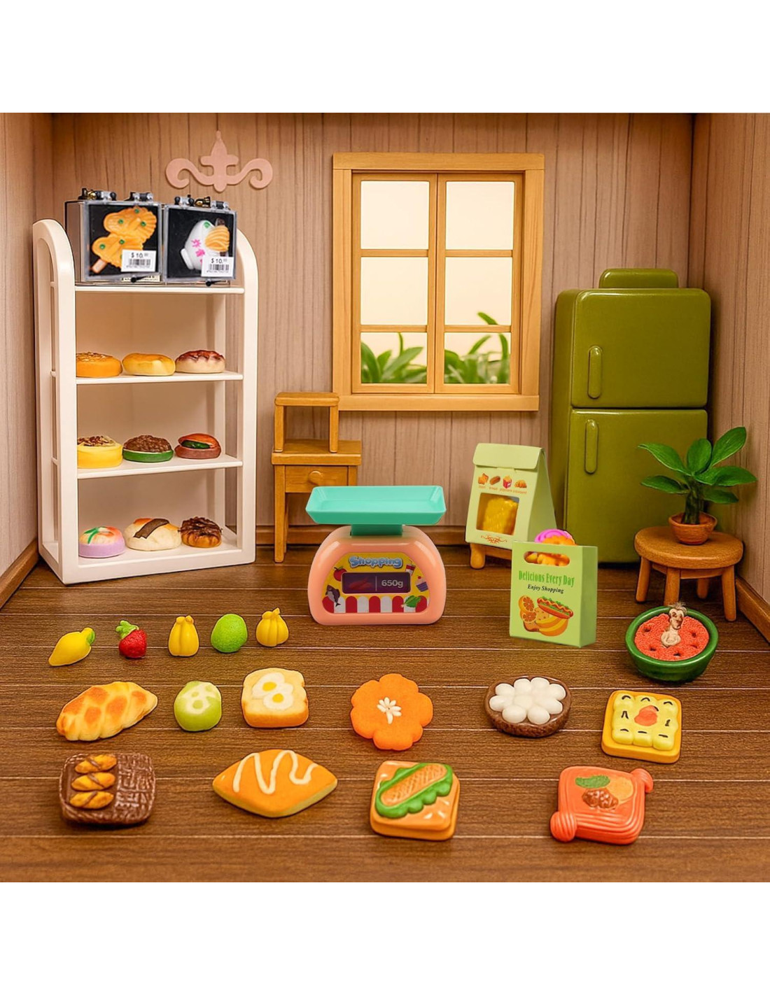 - Materiales de Alta Calidad Estas mini cestas de compras, estantes y caja registradora están elaborados con plástico de alta calidad y duradero. Los juguetes de comida en miniatura están hechos de resina sintética no tóxica de primera calidad. Todos los artículos son inodoros, tienen superficies lisas, poseen una textura firme pero resistente, y están diseñados para durar. La apariencia realista mejora la decoración de tu casa de muñecas, haciendo que el tiempo de juego sea más atractivo.