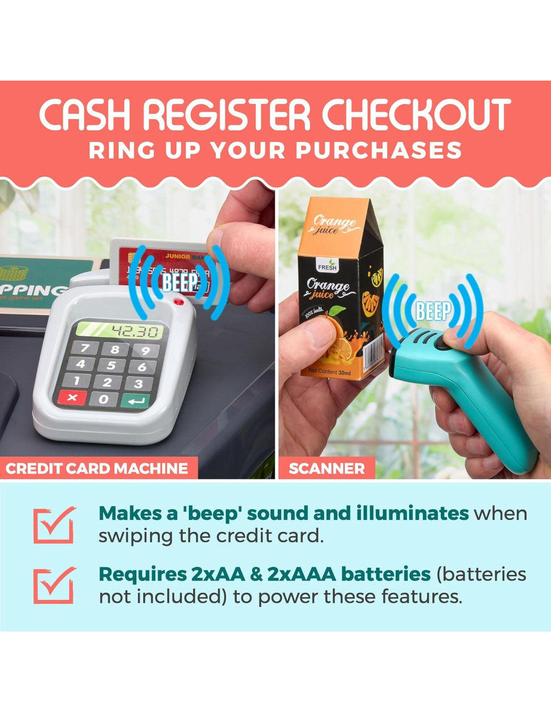 - CONJUNTO DE SUPERMERCADO COMPLETO: Además de la máquina de tarjetas de crédito y el escáner con funciones realistas, este conjunto viene completo con una línea completa de accesorios de juego de imitación. Incluye estantes de múltiples capas donde puedes exhibir tus comestibles. Compra diferentes tipos de alimentos, verduras y frutas y colócalos en tu carrito de compras. Llévalos al mostrador de pago y registra todos tus comestibles como en un verdadero supermercado.