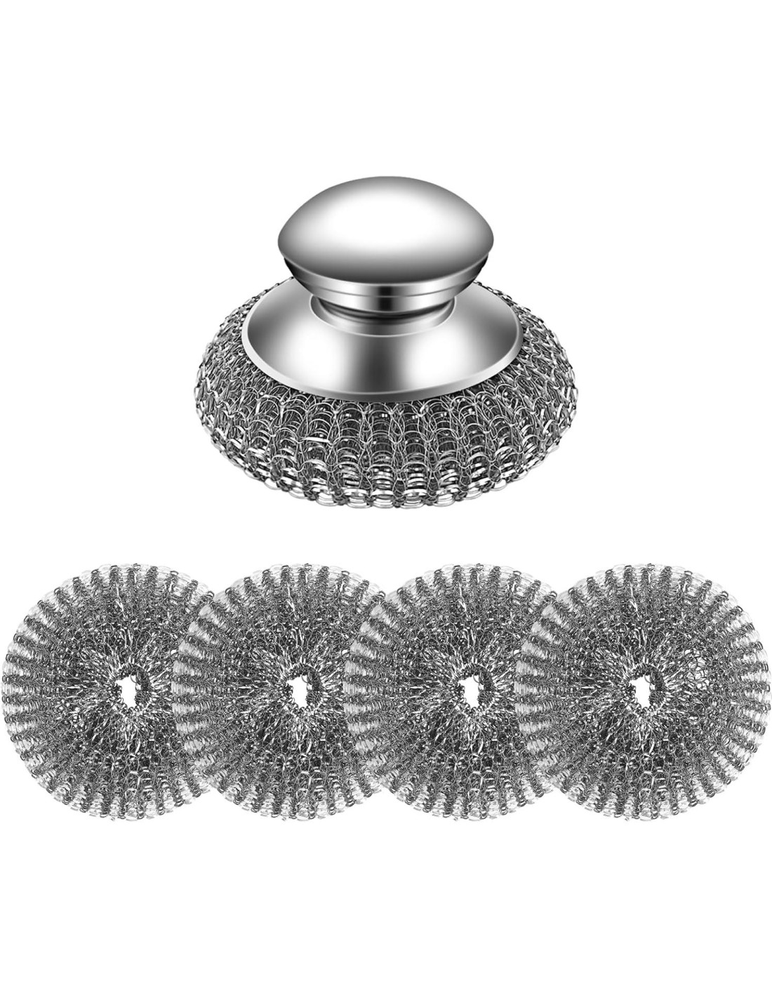 - JUEGO COMPLETO: El paquete incluye 2 mangos ergonómicos y 4 almohadillas de estropajo de lana de acero inoxidable de repuesto para necesidades de limpieza versátiles
