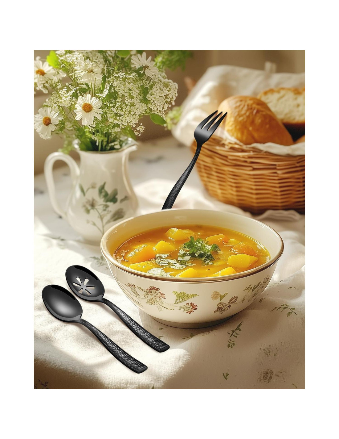 - ELABORADO CON CUIDADO: Cada mango del juego de servicio negro presenta un detalle de patrón martillado único y curvas elegantes, y cuenta con un acabado pulido que lo hace llamativo y deja una impresión duradera, proporcionando el complemento refinado perfecto para tus ocasiones gastronómicas y creaciones culinarias.