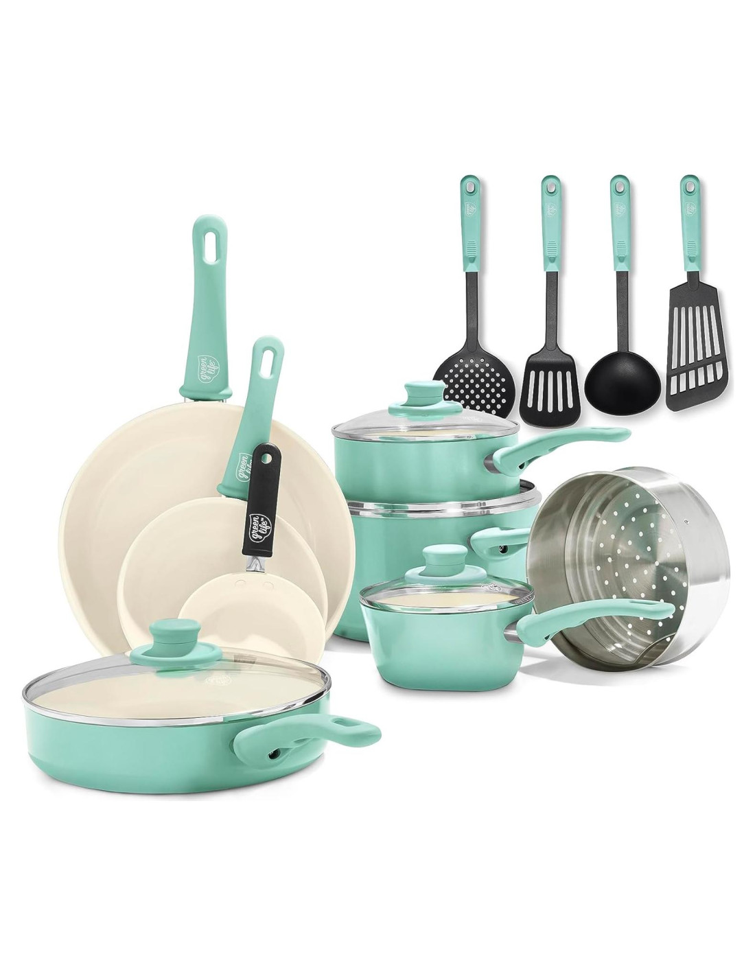 - Componentes incluidos: sartén mini de 4" (10,16 cm), sartenes de 7" (17,78 cm) y 9.5" (24,13 cm), cacerolas de 1 cuarto (0,95 litros) y 2 cuartos (1,89 litros) con tapas, olla de 5 cuartos (4,73 litros) con tapa, sartén de saltear de 2.5 cuartos (2,37 litros) con tapa, vaporera de acero inoxidable de 7" (17,78 cm) y 4 utensilios de cocina