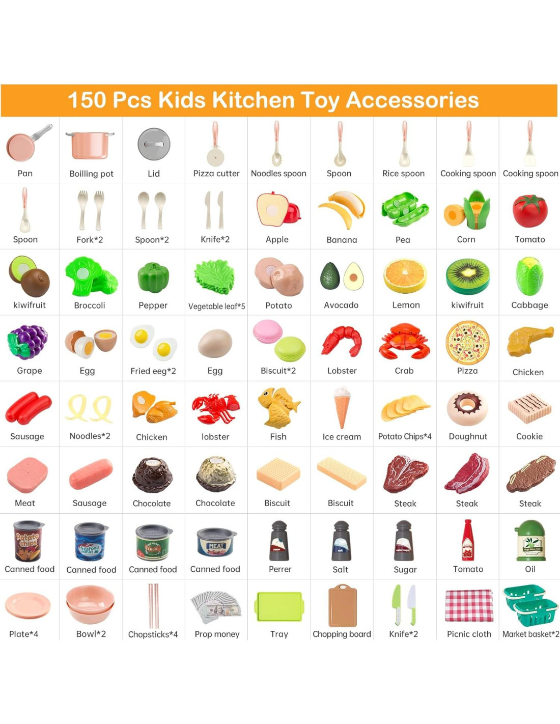 - Simular escenas de la vida y experiencia de cocina Cada set de cocina viene con 150Pcs de juguetes de cocina de diseño abierto y colores frescos, incluye juegos de ollas y sartenes, tetera, tazones, platos, palillos, utensilios de cocina de juguete, juego de cuchillos, comida y verduras y frutas cortables de juguete con 2pack cesta, set de comida rápida, tela de picnic, postres y dinero de juguete, mucho más para proporcionar horas interminables de diversión