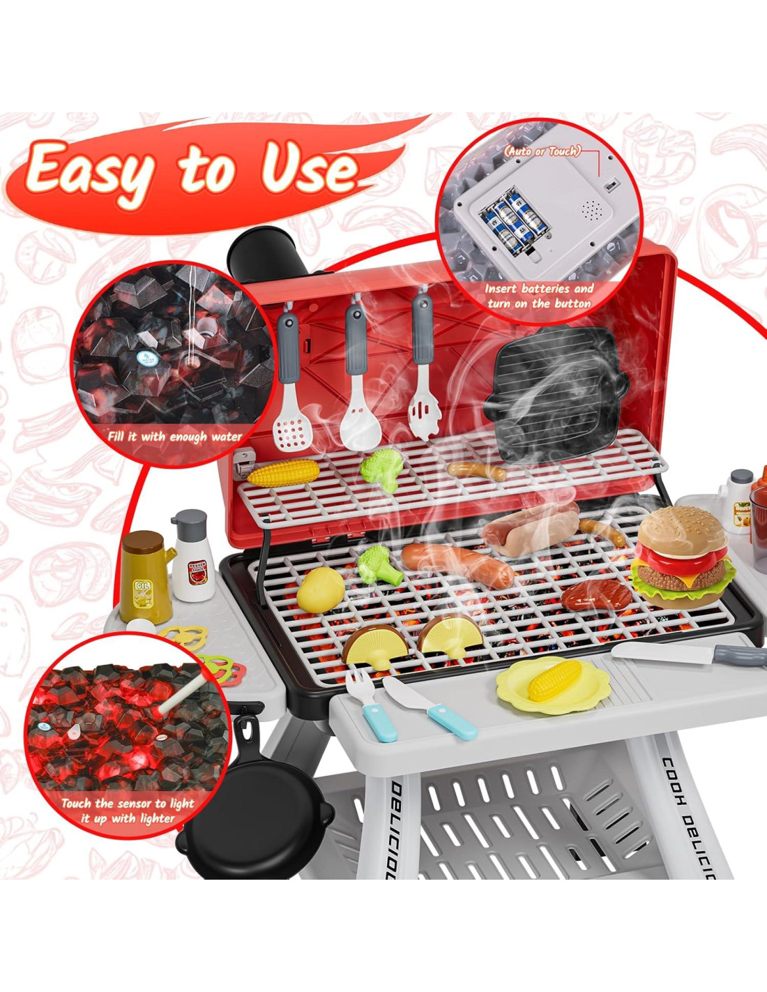 - Experiencia de Barbacoa Realista Nuestro juego de cocina de barbacoa trae la experiencia de asar a la vida con funciones realistas de humo, fuego y sonido. El humo de los juguetes de parrilla es humo seguro creado por un vaporizador de agua, mientras que las luces LED y los sonidos crepitantes recrean una atmósfera real de BBQ, añadiendo un toque auténtico a su juego de simulación. Los niños pueden mejorar su imaginación y creatividad cocinando deliciosas comidas con sus amigos.