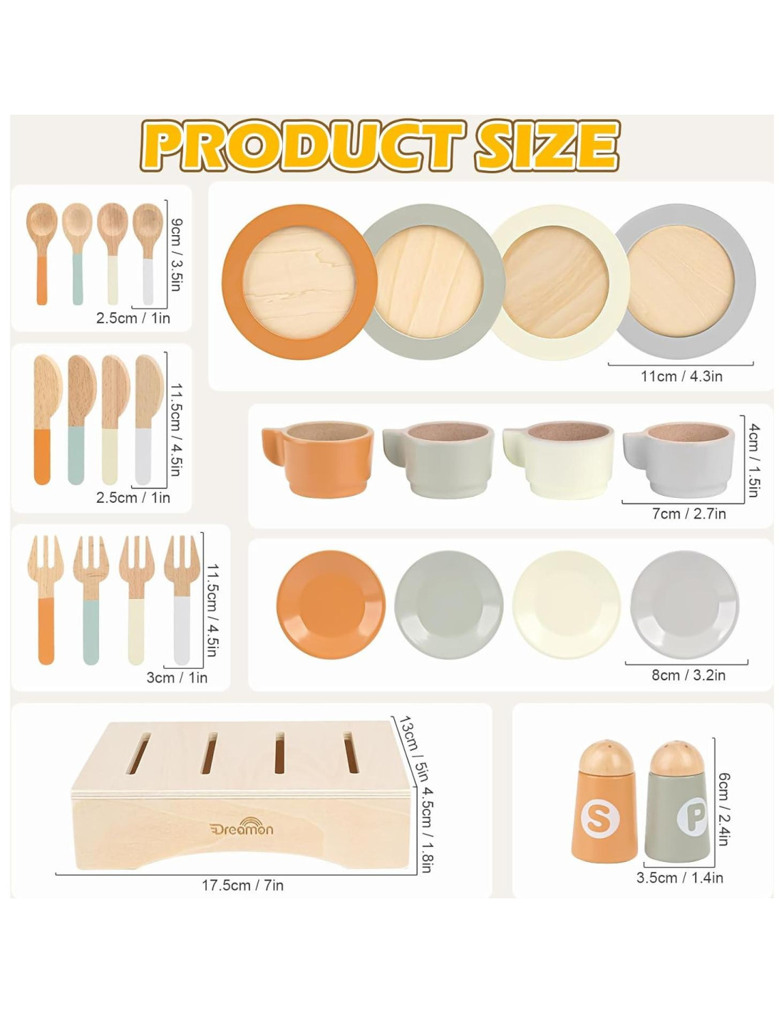 - JUEGO DE 27 PIEZAS - Este conjunto de juguetes de cocina para niños incluye todo lo necesario para cuatro: platos, cubiertos, tazas, platillos y saleros. Ideal para cenas de juego, viene con un soporte de madera que también es un organizador.