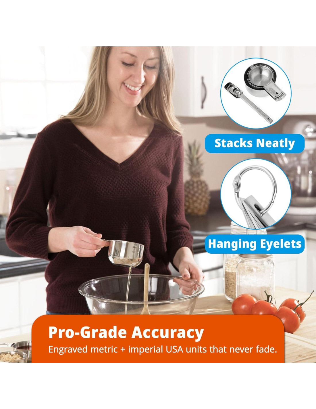 - Marcas Grabadas de Precisión - Medidas en U.S. y métricas (tazas, cucharadita, cucharada, mL) que no se desvanecen garantizan precisión tanto para ingredientes líquidos como secos.