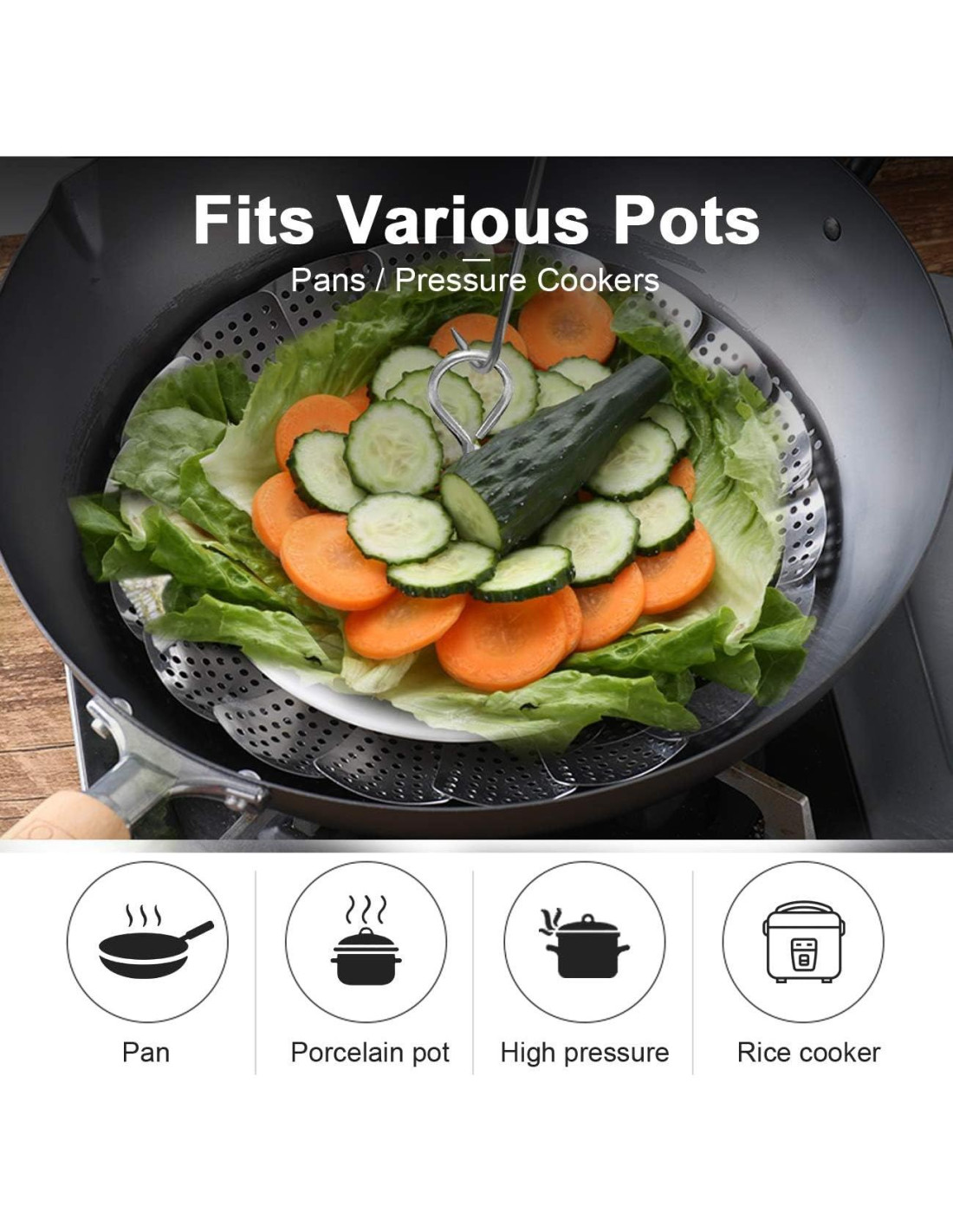 - TAMAÑOS AJUSTABLES QUE SE ADAPTAN A VARIAS OLLAS: Esta vaporera se puede colapsar para un almacenamiento compacto y se expande para adaptarse a ollas con un diámetro de 5.5 pulgadas (13,97 cm) hasta 9.5 pulgadas (24,13 cm), como ollas instantáneas de 3, 5, 6 y 8 cuartos (qt), olla a presión, sartenes, arrocera, freidora de aire