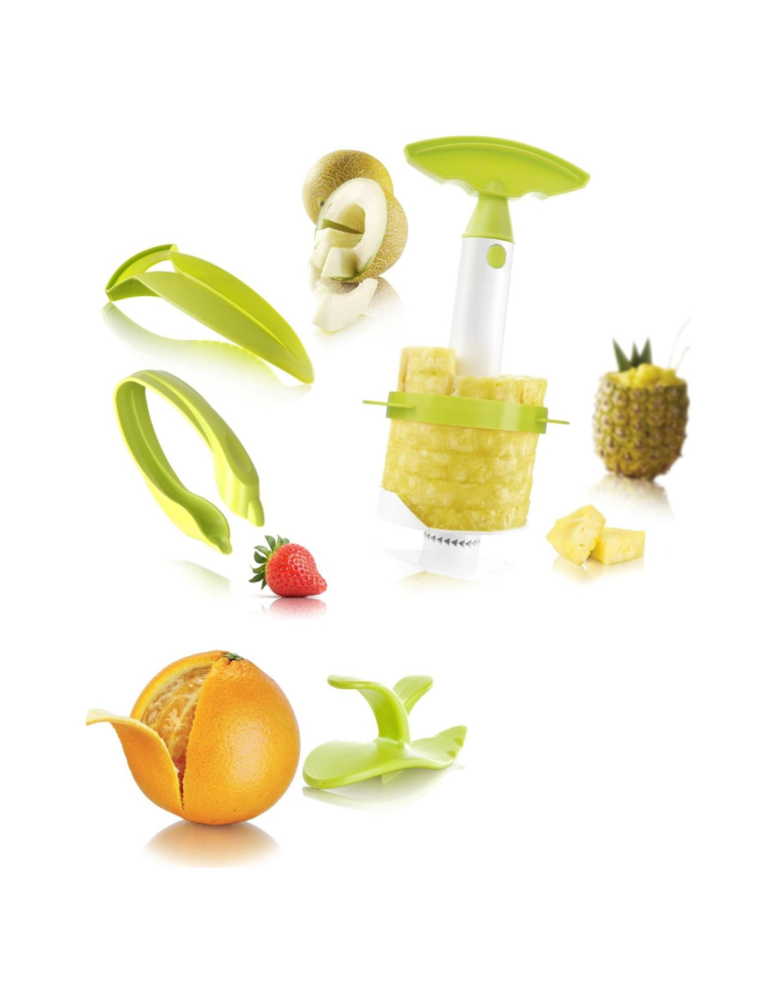 - Contiene: 1 x pelador/cortador/rodajeadora de piña 4 en 1, 1 x cortador de melón, 1 x desinfectador de fresas y 1 x pelador de cítricos