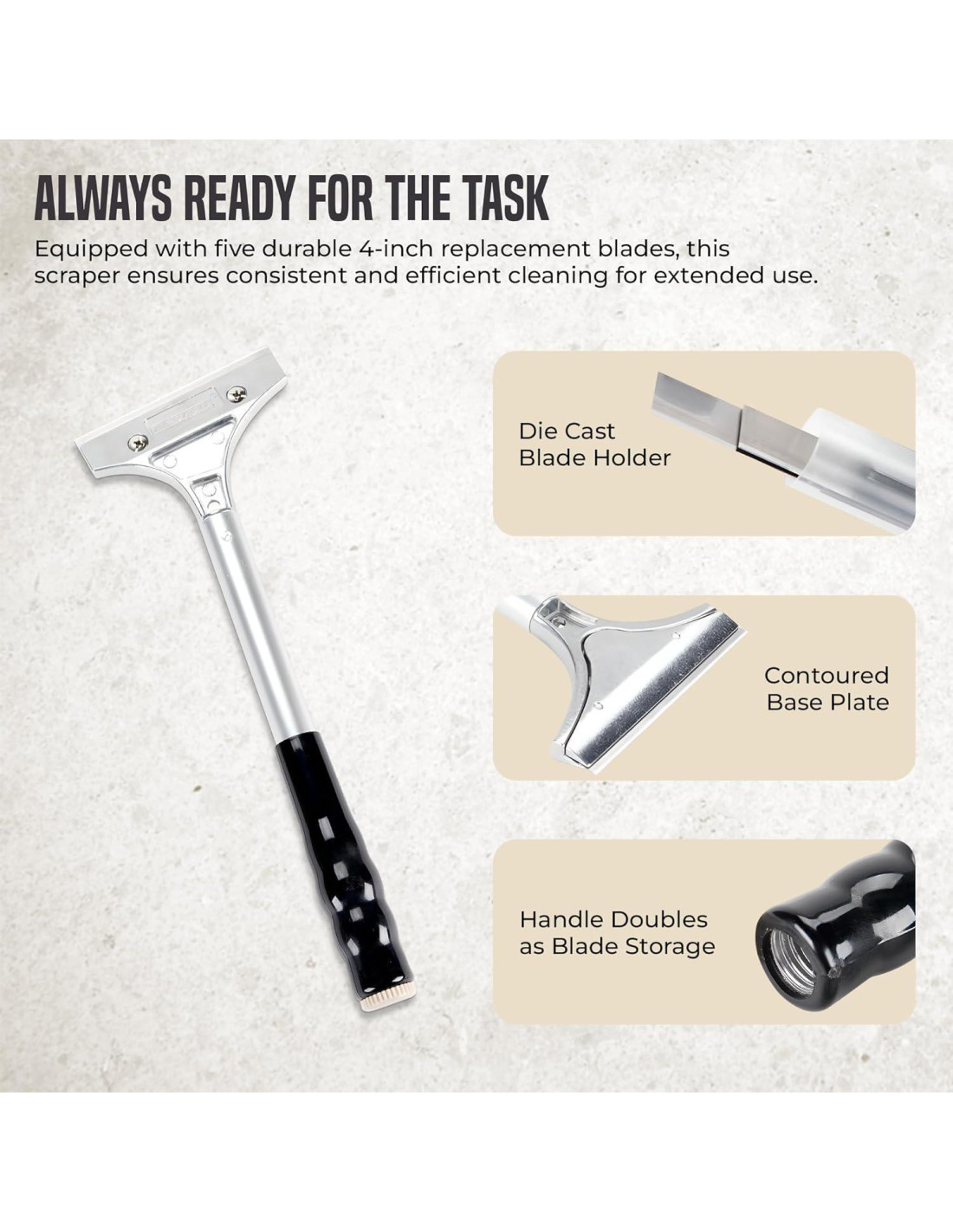 - Incluye Cinco Cuchillas de 10.16 cm: Este raspador de alta resistencia viene con un conjunto de cinco cuchillas de 10.16 cm, asegurando que tengas suficientes repuestos para un uso prolongado. Reemplaza fácilmente las cuchillas cuando se desgasten para una limpieza continua y efectiva.