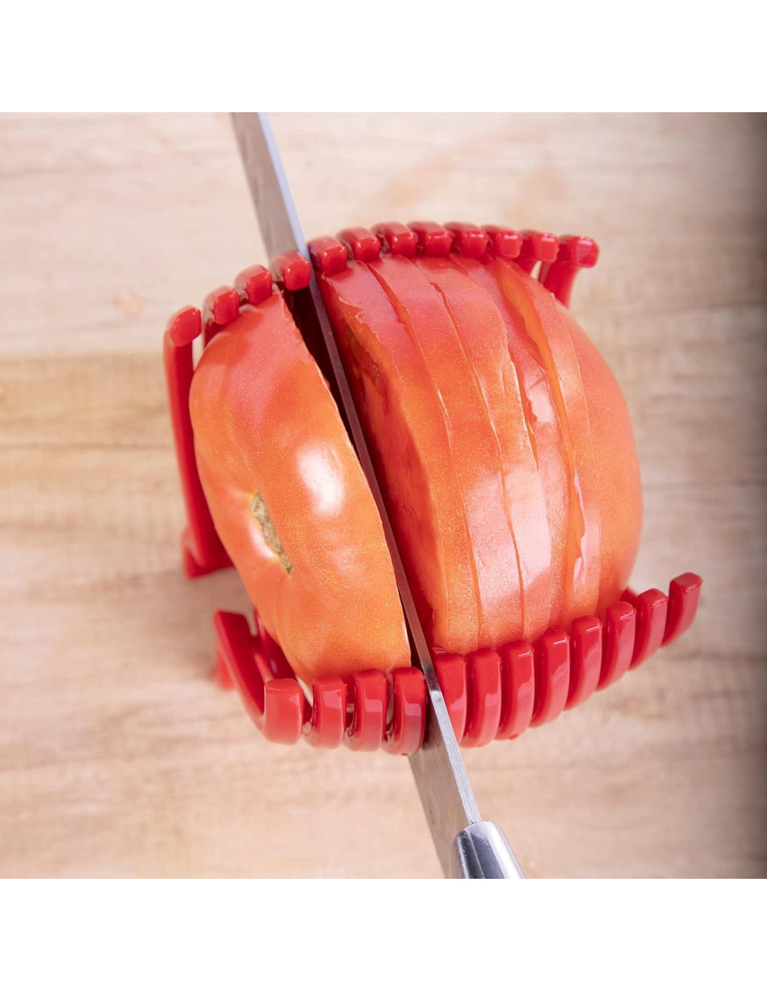 Herramienta de Sostenedor de Tomate Guía de Corte Ideal para Tomates Papas Pimientos Cebolla y Más! Funciona como una mano libre mientras cortas SAFEMENTE rebanadas perfectas!