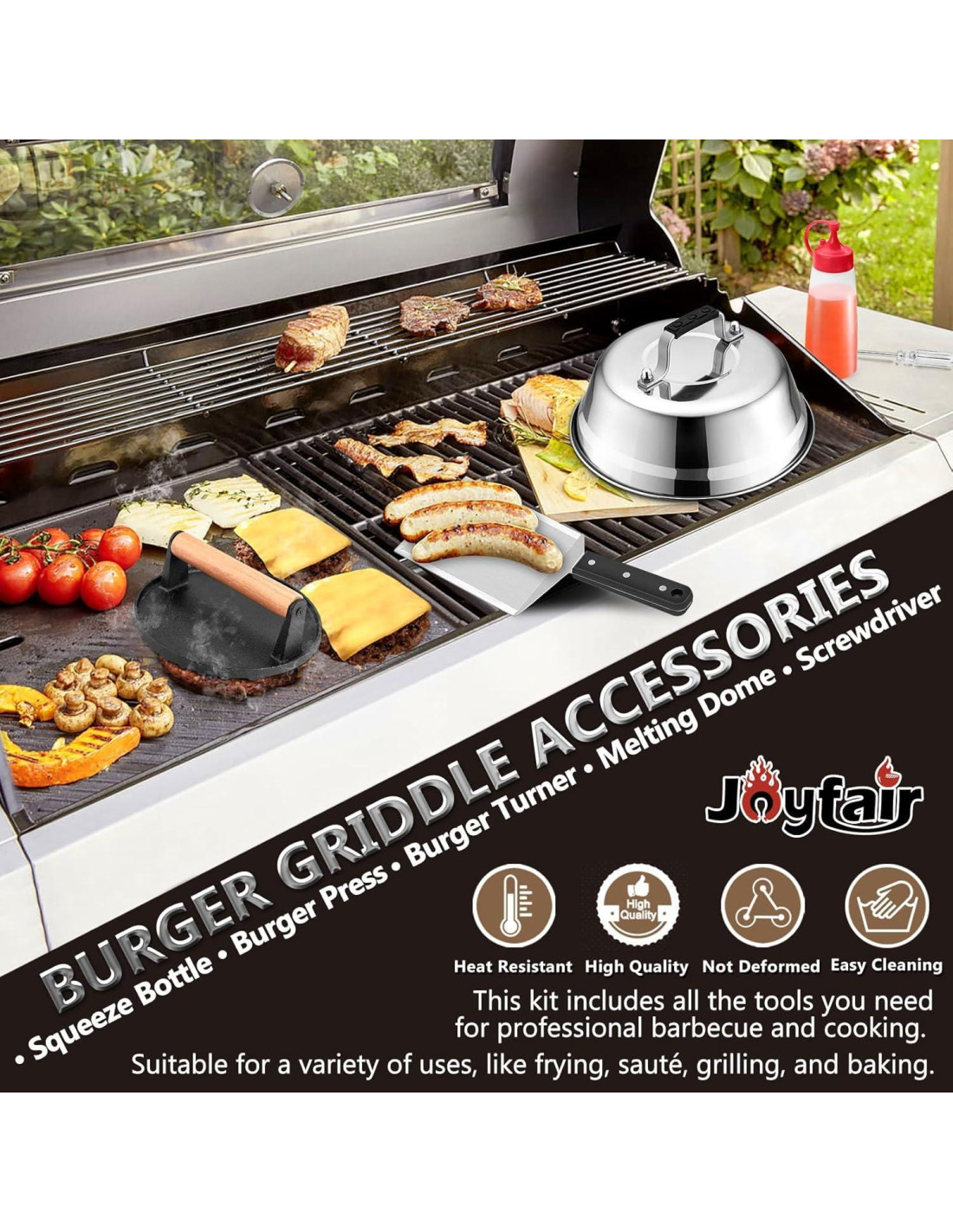 - KIT DE VERSATILIDAD Cubierta para basting es ideal para derretir queso, cocinar verduras al vapor rápidamente y asar pizza de manera uniforme, también puede mantener la comida caliente o prevenir el polvo, el turner para hamburguesas te ayuda a manejar diferentes alimentos, como voltear bisteques, panqueques, transferir hamburguesas, pescado, etc., la prensa para asar es perfecta para presionar hamburguesas, salchichas, tocino y más, botella de salsa con escala clara para un control de dosificación preciso cada vez