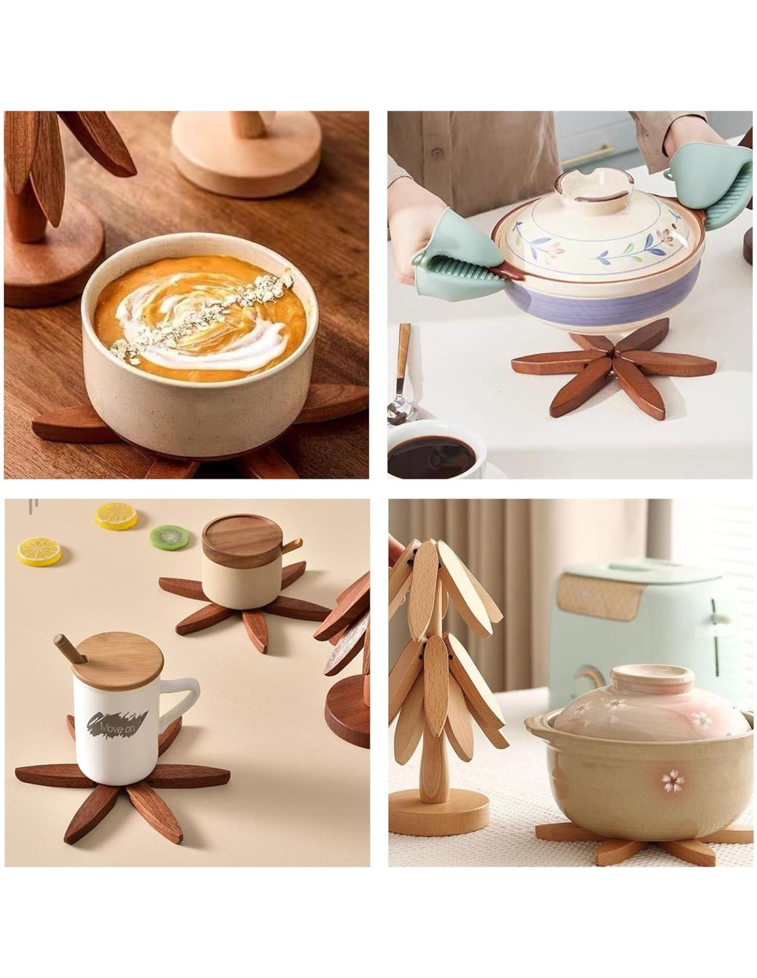 - Diseño Ingenioso: Cada trivet de madera para platos calientes no necesita ser aplanado antes de su uso, solo coloque la vajilla y se desplegará automáticamente y cumplirá su función, después de usarlo, el trivet se recuperará automáticamente a la forma de una hoja