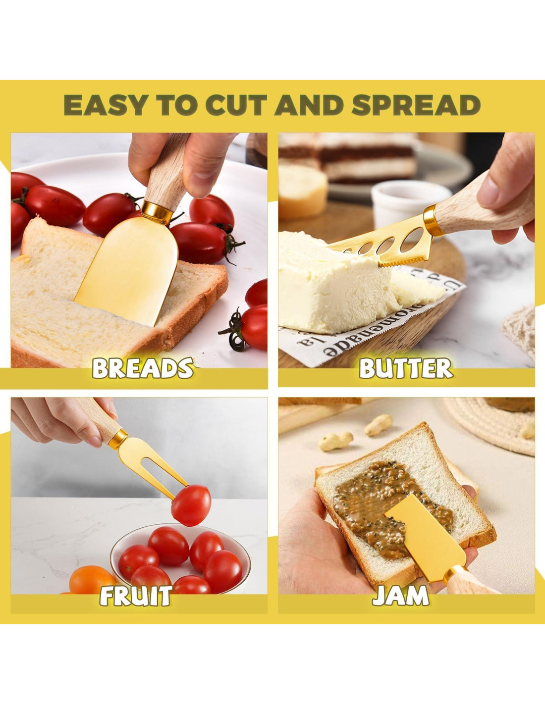 - [Materiales Premium y Tecnología Avanzada] Los cuencos para dips, untadores, pinzas de servicio, tenedor y cuchara están fabricados con acero inoxidable de alta calidad con tecnología integrada avanzada. Los cuchillos para queso tienen hojas de acero inoxidable y mangos de madera de roble, lo que los hace duraderos, resistentes al desgaste y a la corrosión. Sus superficies pulidas a espejo son suaves, brillantes y fáciles de limpiar. A todos les encantarán, son tu mejor opción.