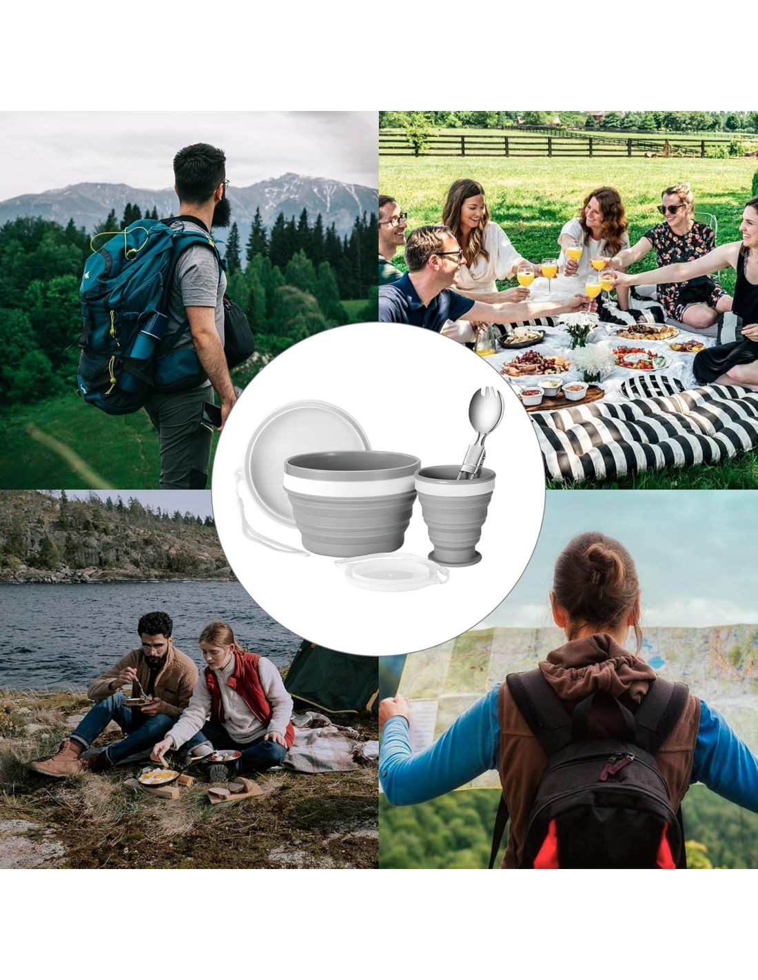 - Un Conjunto Completo que Necesitas: El kit de comida para camping viene con 1 Tazón Plegable de Silicona (950ml), 1 Taza Plegable de Silicona (200ml) y 1 Cuchara de Ensalada de Acero Inoxidable.
