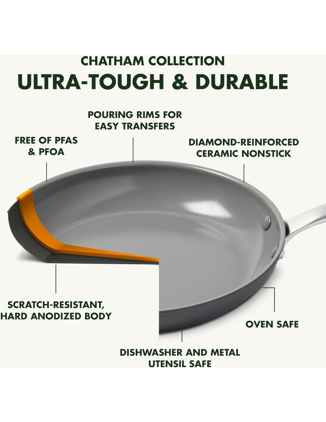 - Material: Cerámica no pegajosa saludable, libre de PFAS, anodizado duro, mangos de acero inoxidable