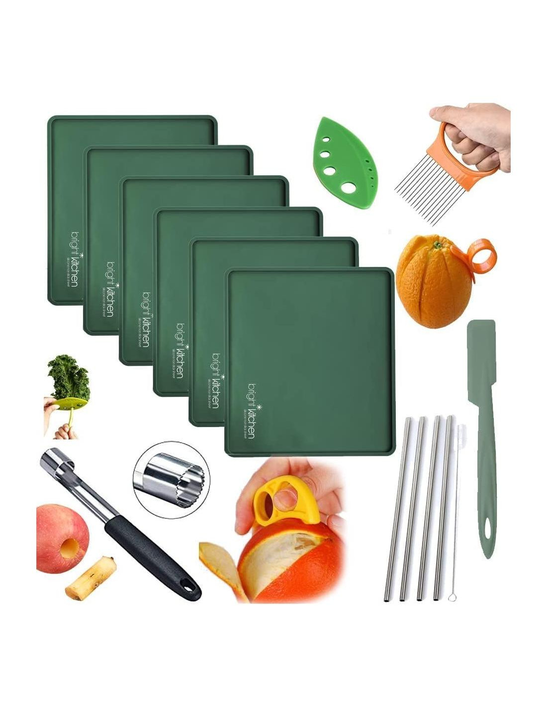 PAQUETE DE 6 hojas "EDGE" + ¡Paquete de Accesorios! Las hojas originales de Bright Kitchen, literalmente inventamos esta hoja, ¡cuidado con las copias de baja calidad que aparecen de empresas desconocidas! Las hojas tienen un borde con un labio elevado alrededor del borde para evitar que los ingredientes se deslicen fuera de la hoja. El PAQUETE DE ACCESORIOS de 7 piezas incluye, popotes de acero inoxidable, espátula de silicona, descorazonador de manzana, guía de corte, 2 peladores de cítricos, deshidratador de hierbas, ¡genial para chips de col rizada! SILICONA SEGURA - Los productos de Bright Kitchen utilizan silicona certificada como segura para alimentos y probada en laboratorio de forma independiente por su seguridad. A diferencia de las copias de baja calidad donde la silicona es de origen desconocido y puede ser insegura y/o hecha con rellenos desconocidos. PROBADO por el experto independiente de terceros, SGS, con sede en Suiza, el líder mundial en pruebas de seguridad, inspección y certificaciones. SIN BPA, no contiene látex, plomo ni ftalatos. Apto para lavavajillas - Reutilizable una y otra vez. Estas hojas se limpian fácilmente con agua tibia y una esponja, ya que son ANTIAHIDRANTES: ¡los alimentos deshidratados se despegan fácilmente de estas hojas para un secado súper fácil! Los bordes tienen una profundidad de 1/4" (0,64 cm). Dimensiones de 11.8" x 10.6" (30,00 cm x 26,92 cm) Compatible con el deshidratador de 6 bandejas Cosori CP267-FD, compatible con NutriChef de 600 vatios NCDH6S.5 y compatible con deshidratadores comerciales de alimentos Magic Mill MFD-7070 de 7 bandejas. Resistente a temperaturas de 450 grados F (232 grados C) y resistente al frío hasta -40 grados F (-40 grados C). La empresa estadounidense Bright Kitchen es una empresa familiar de California, EE. UU. Nuestros productos están diseñados, empaquetados y enviados desde EE. UU., con soporte al cliente completo de EE. UU. de nosotros, la familia Bright Kitchen. Est. 2011 GARANTÍA DE POR VIDA. Bright Kitchen es la ÚNICA hoja deshidratadora con una garantía de por vida completa. GARANTÍA DEL 100% - Si no está satisfecho por CUALQUIER motivo, contáctenos, sin preguntas, pero sabemos que le ENCANTARÁ su hoja.