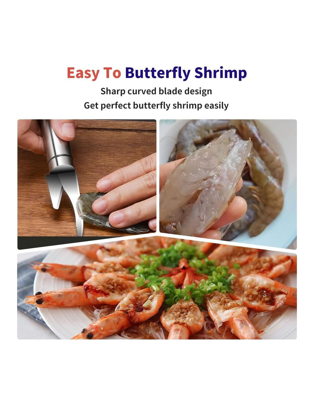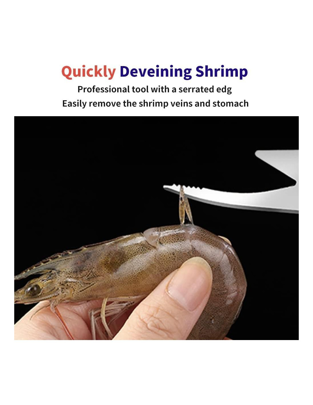 - [Limpieza y Pretratamiento Multifuncional] : Esta herramienta para desvenar camarones facilita y acelera la limpieza y el pretratamiento de los camarones de la manera que desees: Un borde serrado en el lado sin filo puede eliminar fácilmente las venas y el estómago del camarón, por lo que obtienes un camarón completamente limpio con cáscara; La hoja curva afilada se puede usar para cortar la cabeza y la espalda del camarón para obtener camarones mariposa; El pico de águila en el otro extremo está diseñado para quitar fácilmente la cáscara, mientras deja el camarón intacto y sin dañar.