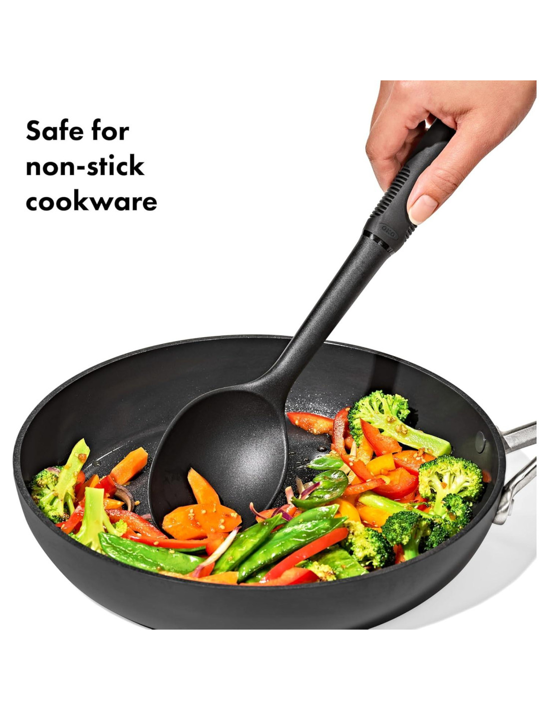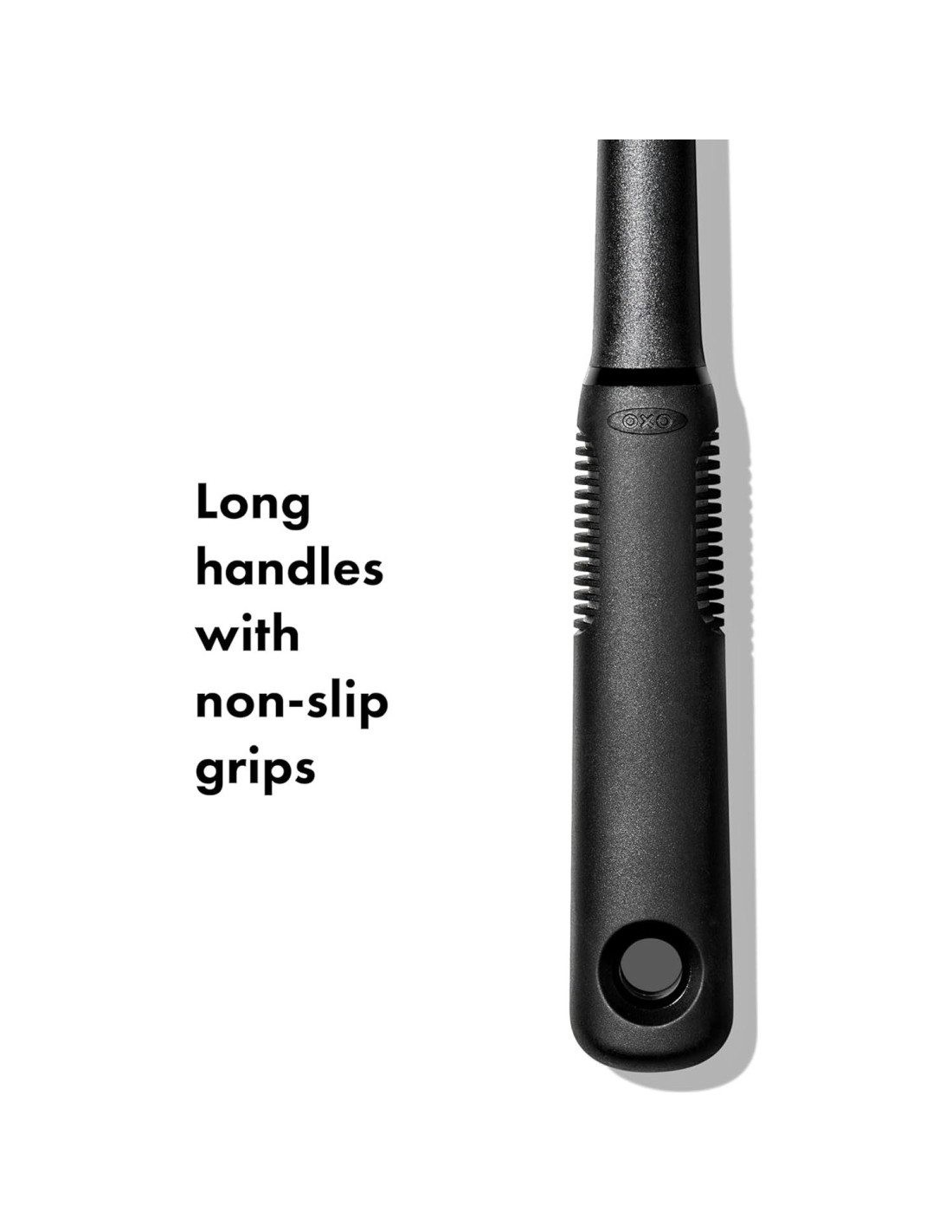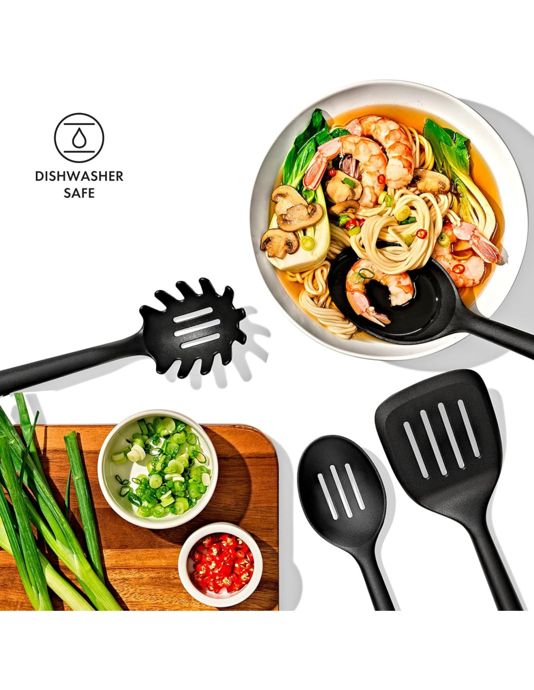 Nuestros utensilios de nylon son superiores, con cabezales sobredimensionados, cuellos extra largos y resistentes, y mangos cómodos. Los cabezales son resistentes al calor hasta 400F (204.4C) y no rayan las ollas antiadherentes. El set incluye: Espátula Cuadrada, Cuchara, Cuchara Ranurada y Servidor de Espagueti.