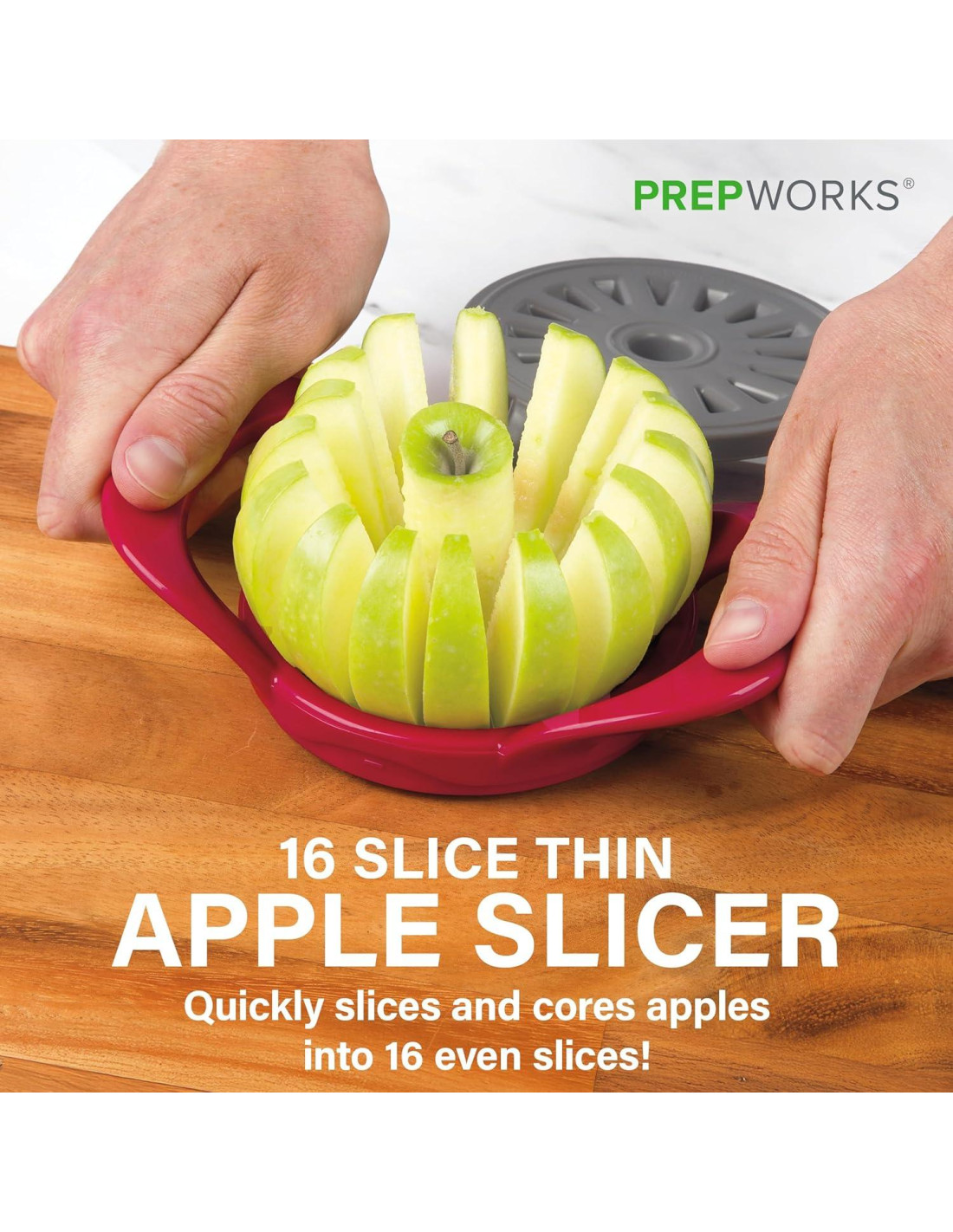 Progressive International es su fuente para la más amplia gama de herramientas de cocina funcionales, inventivas y divertidas, y grandes ideas llevadas a la práctica. Nuestros gadgets funcionales, herramientas, artículos de preparación de alimentos y productos para el hogar hacen que cocinar y preparar comidas sea más eficiente y divertido. En Progressive, la pasión y la creatividad se unen para crear el equilibrio adecuado entre forma y función para los cocineros de hoy. Nuestros diseñadores internos pasan horas en la cocina ideando formas de mejorar una variedad de tareas y herramientas tradicionales. Establecida en 1973, nuestro compromiso con la calidad y el servicio nos permite ofrecer una amplia selección de utensilios de cocina de calidad y otros productos para el hogar. Los productos de prepworks de Progressive International son creados por personas que entienden que tener la herramienta de cocina correcta puede hacer que su experiencia culinaria sea más placentera. prepworks - elementos esenciales para el cocinero de hoy. El Cortador de Manzana Delgado de prepworks es una forma rápida y segura de descorazonar y rebanar una manzana fácilmente. Con el Cortador de Manzana Delgado es tan fácil como empujar, girar y sacar. Coloque la manzana en la encimera, con el tallo hacia abajo. Simplemente empuje las cuchillas del cortador de manzana delgado de prepworks hacia abajo sobre la manzana, gire la cubierta protectora por debajo y saque las rebanadas de manzana el resto del camino a través de las cuchillas.