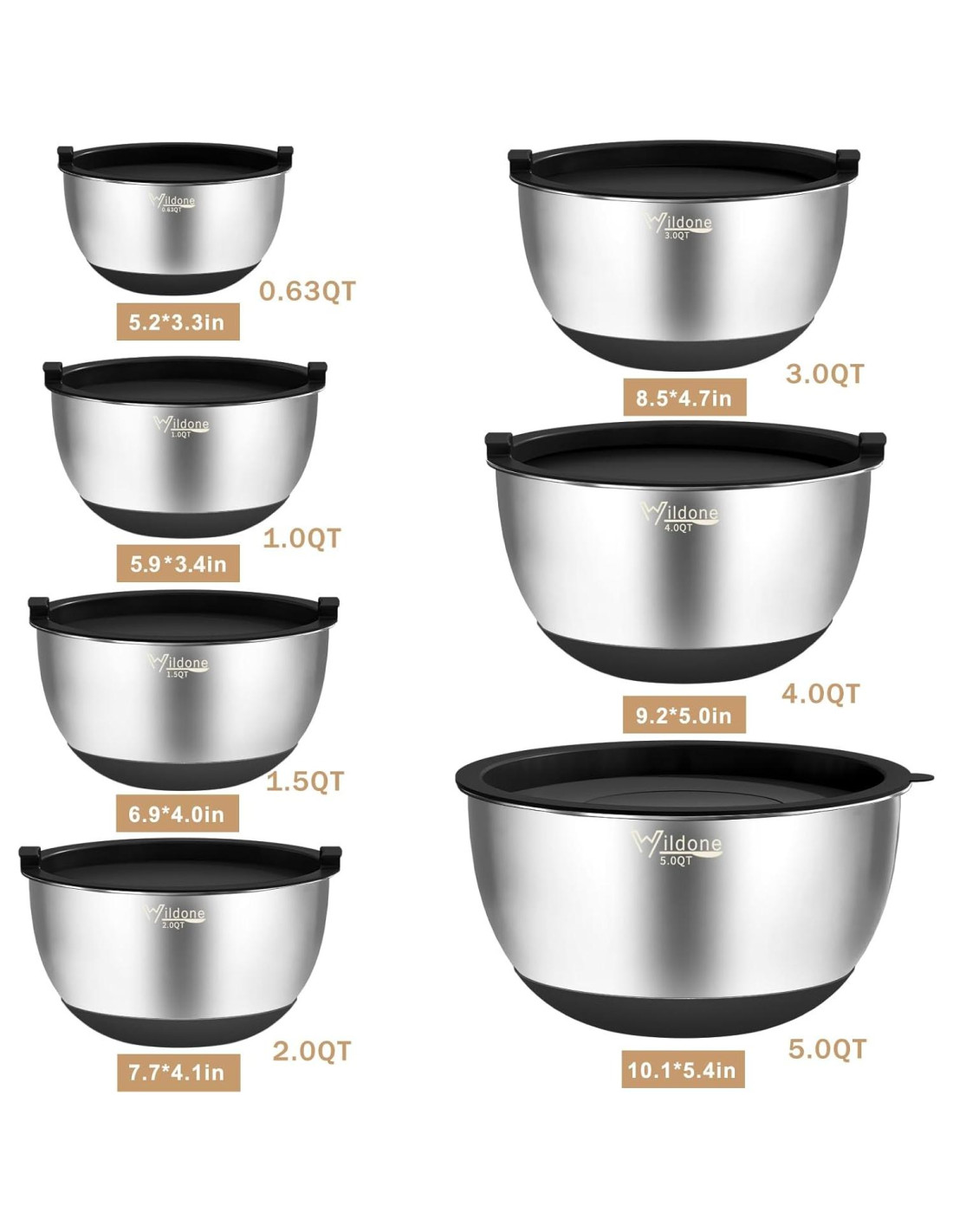 - Juego de Tazones de Mezcla Completo: El juego de tazones de mezcla Wildone contiene 7 tazones de acero inoxidable (5, 4, 3, 2, 1.5, 1, 0.63QT), lo que facilita encontrar el tazón adecuado para cualquier tarea de cocina o necesidad de almacenamiento de alimentos. Con 3 accesorios de rallador, 5 tazas medidoras y 5 cucharas medidoras, brocha de cocina, juego de espátulas, batidor de huevos, separador de huevos y pinzas, los tazones apilables son ideales para mezclar, lanzar, preparar y servir alimentos todo en una herramienta.