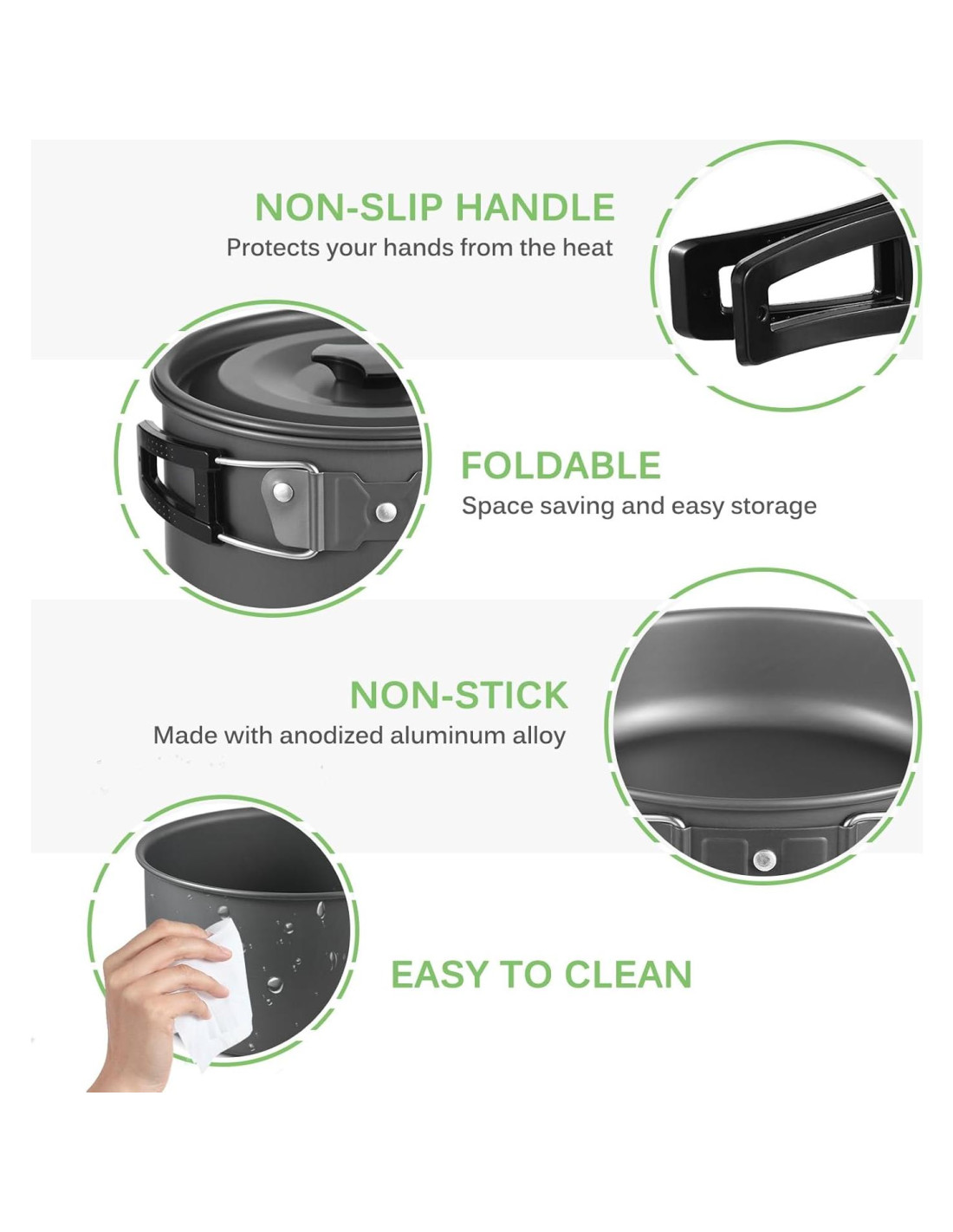 - [KIT DE UTENSILIOS DE COCINA DE ALTA CALIDAD] Todas las ollas y sartenes están hechas de óxido de aluminio duro de alta calidad, que es resistente a altas temperaturas y al desgaste, y es muy adecuado para cocinar al aire libre. Recubierto con un material antiadherente para un uso y limpieza más fáciles. Los cubiertos de cena están hechos de acero inoxidable 304, que es completamente seguro de usar. El paño de limpieza es seguro para usar en la superficie recubierta y permite una limpieza rápida y fácil después de terminar.