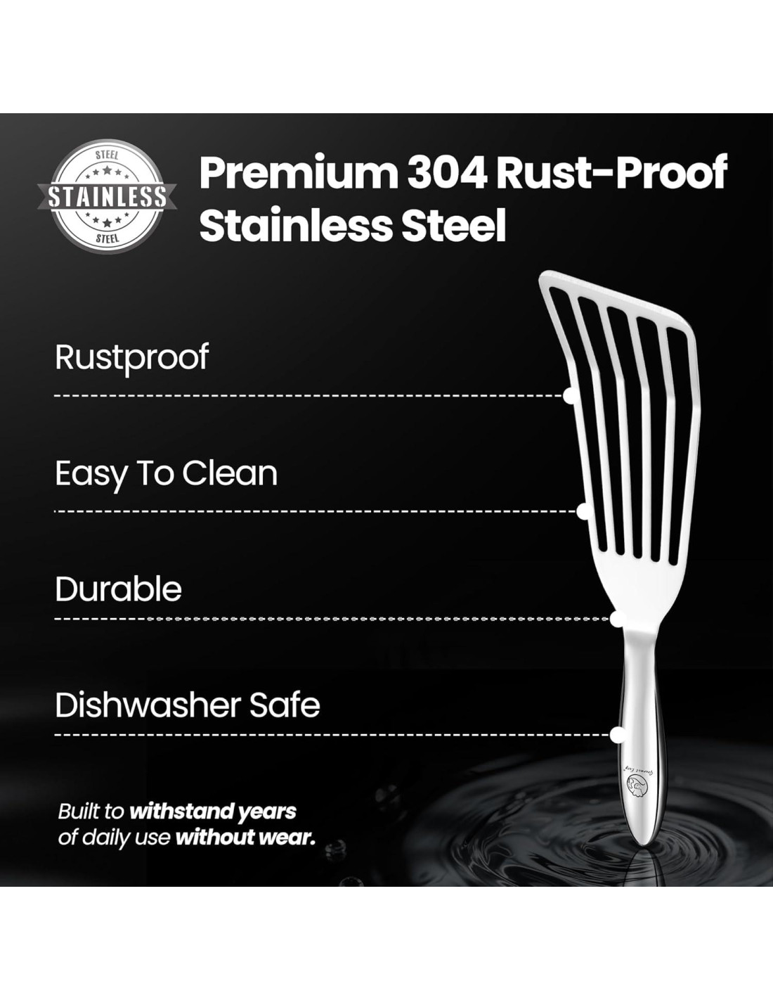 - DISEÑO DE ACERO SIN COSTURAS EN UNA SOLA PIEZA - Fabricada de una sola pieza de acero inoxidable 304. Esta espátula de cocina es a prueba de óxido, no se doblará y cuenta con un diseño sin costuras - sin juntas ni huecos para atrapar alimentos o grasa. Duradera, higiénica y construida para durar.