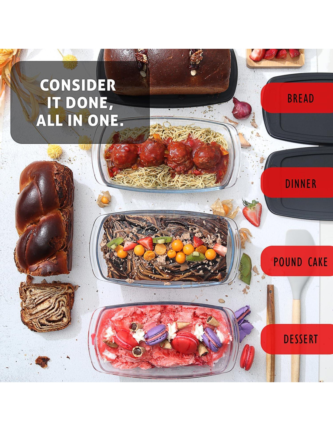 - Más grande que la bandeja de pan estándar: Esta bandeja de pan de vidrio de 1.9 qt (1,8 L) mide 9.25" (23,5 cm) L x 4.5" (11,4 cm) W x 2.5" (6,4 cm) H, con asas anchas para un agarre seguro. Nuestras bandejas para hornear son libres de BPA y ftalatos.