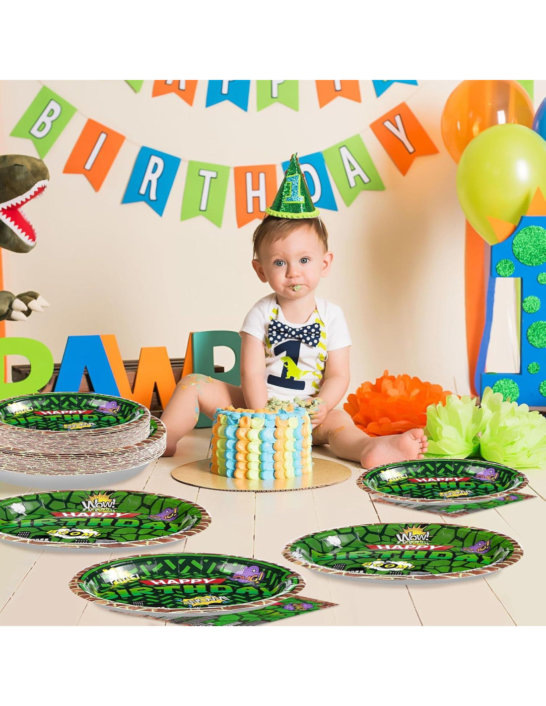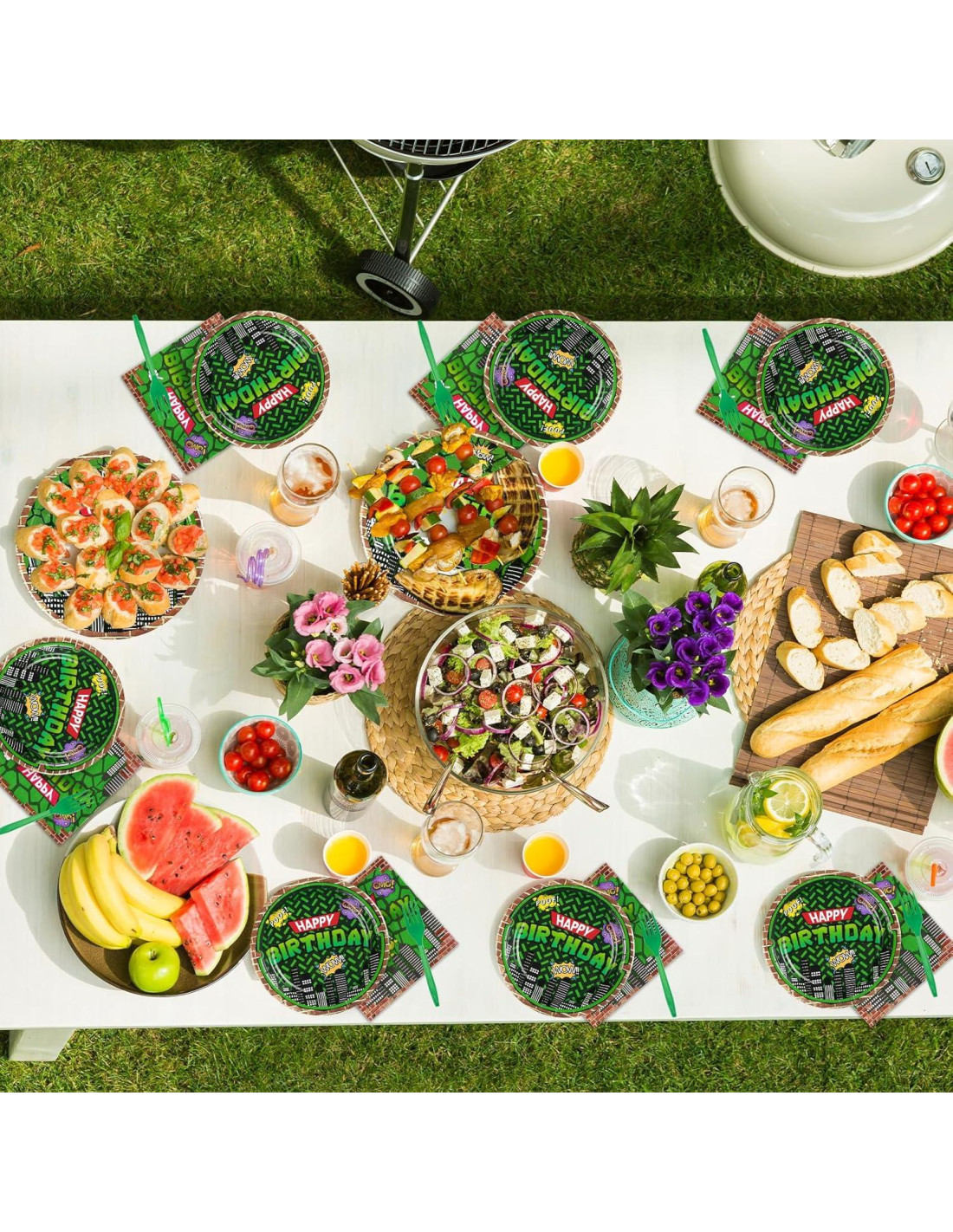 - [Suministros de Fiesta de Tortuga] Nuestros conjuntos de vajilla desechable de fiesta de tortuga verdes incluyen 24 platos de cena de tortuga (23 cm), 24 platos de postre de tortuga (18 cm), 24 servilletas de tortuga (16.5 cm), 24 tenedores verdes, haciendo un total de 96 piezas. Haz que tu fiesta sea inolvidable con decoraciones de fiesta de héroe ninja