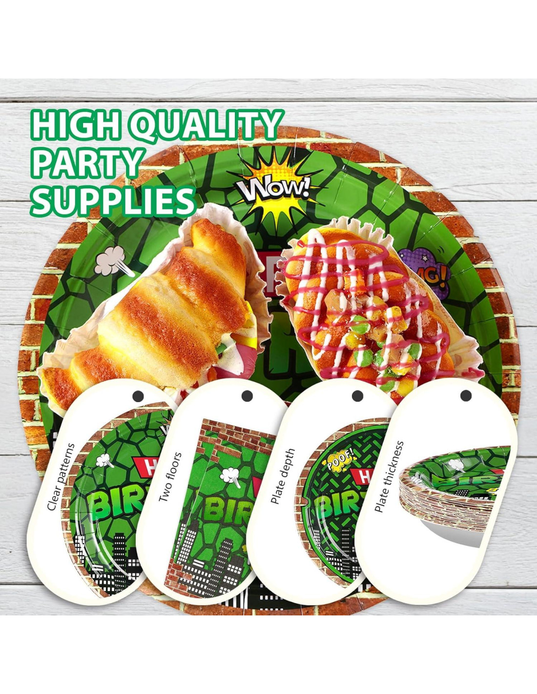 - [Diseño Vibrante de Fiesta de Tortuga] Este conjunto de vajilla de fiesta de héroe de super temática tiene un patrón de textura de tortuga de dibujos animados verdes y elementos de edificios de paisajes urbanos de cómics que capturan la esencia del juego clásico. Con patrones de tema de tortuga de dibujos animados verdes audaces e ilustraciones alegres y geniales, puede proporcionar más disfrute y diversión para tus decoraciones de cumpleaños