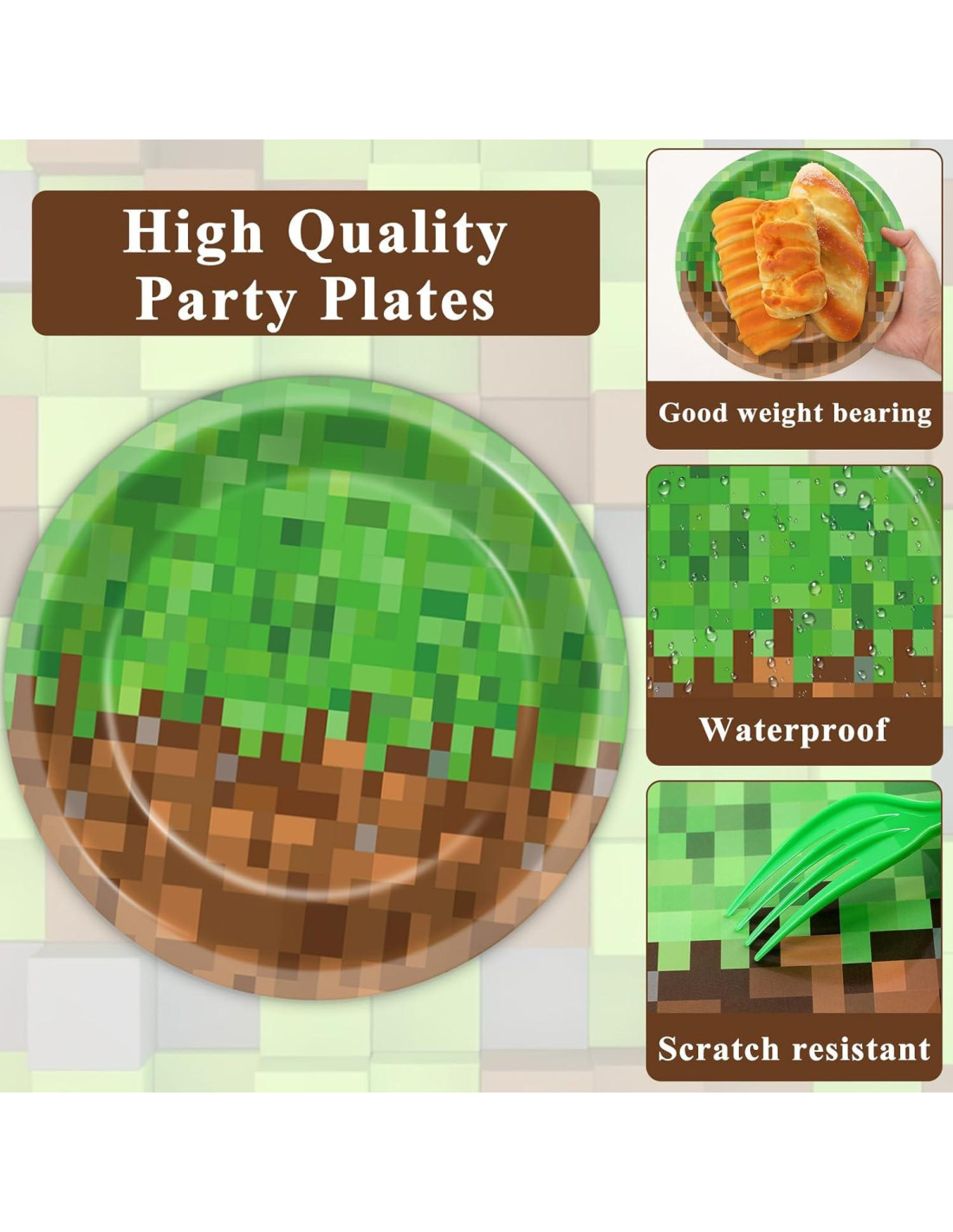 - Diseño clásico: Sumérgete en una experiencia auténtica de fiesta con estos diseños pixelados únicos. Estos suministros de fiesta pixelados exhiben platos de cena con vibrante césped verde y rico suelo marrón, imitando un patrón pixelado realista. Este juego de vajilla de tema minero realmente dará vida a tu celebración.