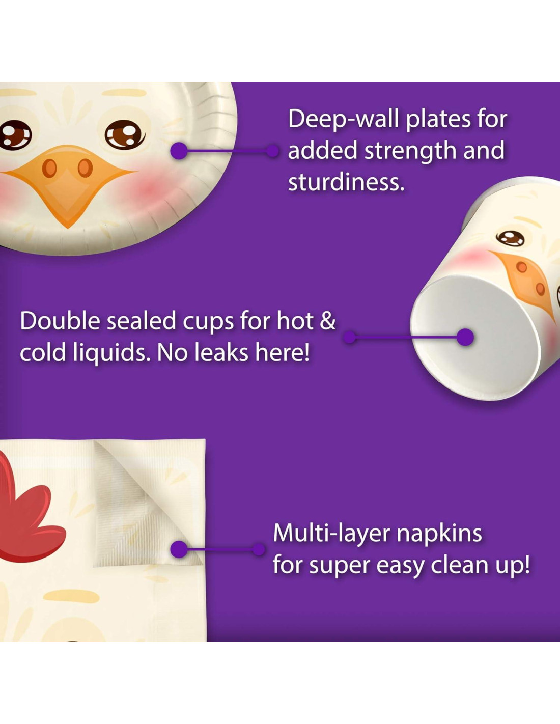 - DISEÑO PREMIUM - Nuestros Suministros para Fiesta Temática de Pollo son adecuados para fiestas de cumpleaños de niñas y niños, celebraciones navideñas con tu familia y amigos, eventos especiales o simplemente para comidas diarias llenas de diversión, bocadillos y postres con picnics y parrilladas. Los gritos de alegría serán tu recompensa cuando uses estos divertidos y únicos sets de vajilla para fiestas.