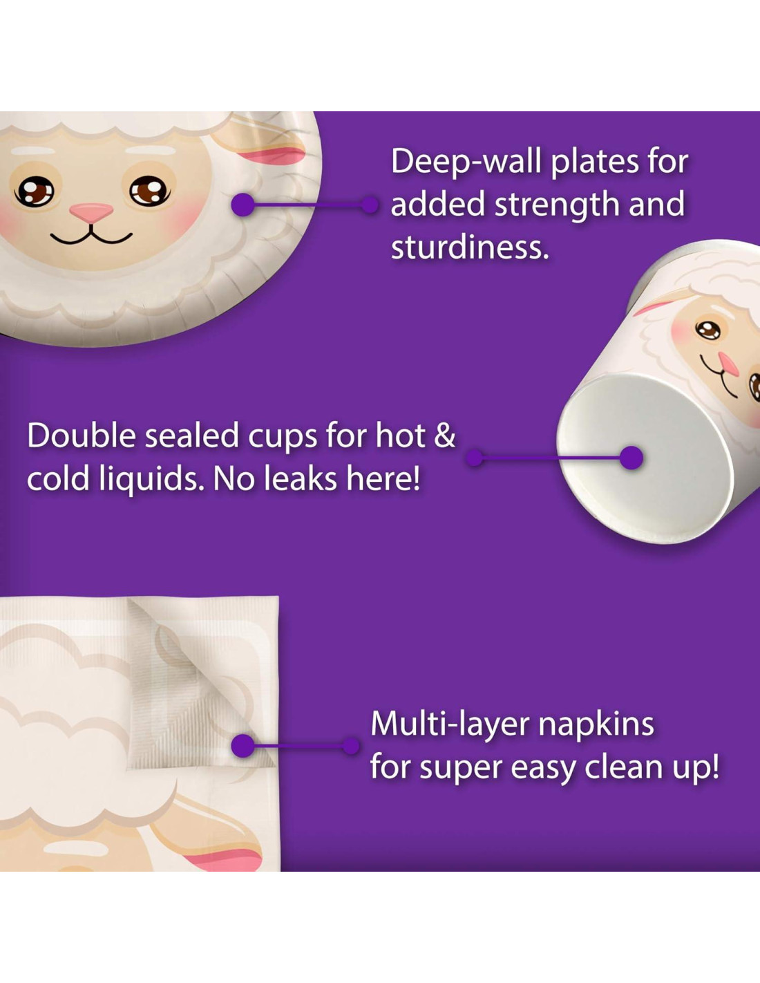 - DISEÑO PREMIUM - Nuestros Suministros para Fiesta de Tema de Oveja son adecuados para fiestas de cumpleaños de niñas y niños, celebraciones navideñas con tu familia y amigos, eventos especiales o simplemente para comidas diarias llenas de diversión, bocadillos y postres con picnics y barbacoas. Los gritos de alegría serán tu recompensa cuando uses estos divertidos y únicos juegos de vajilla para fiestas.