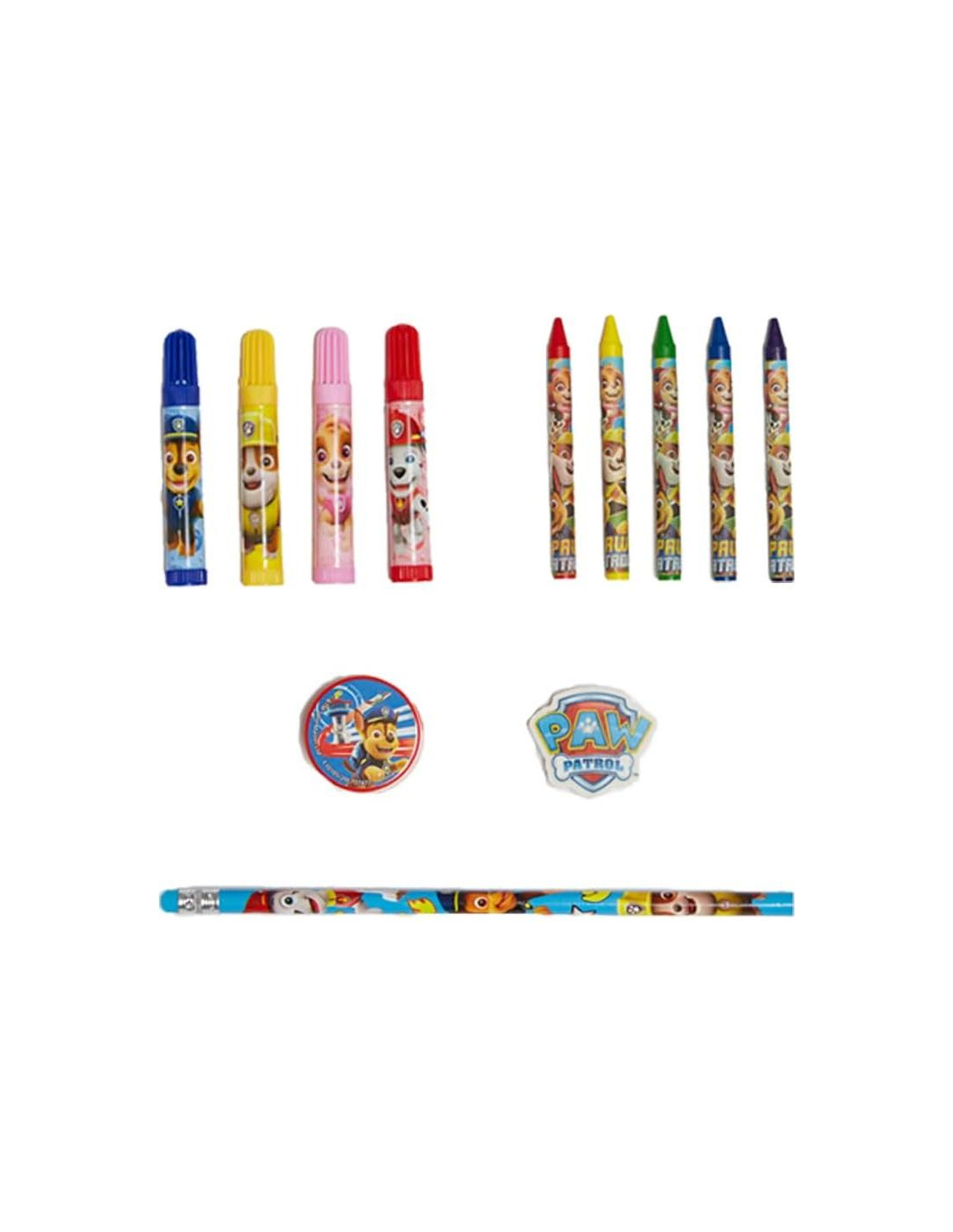- SUMINISTROS ESCOLARES PAW PATROL + SET DE ARTE - Nuestro set de arte para niños más popular viene completo con suministros de arte para colorear de Paw Patrol: 4 marcadores, 5 crayones, un lápiz, un sacapuntas, un borrador, un bloc de dibujo de 10 hojas y 2 hojas de pegatinas.