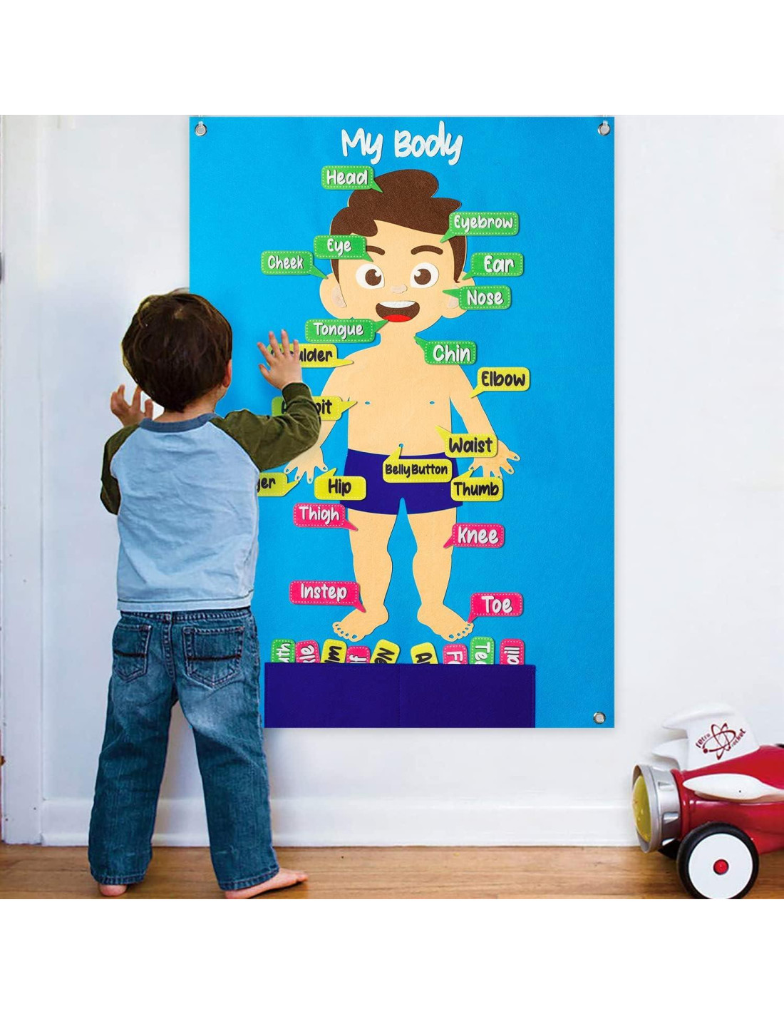- Conjuntos Gigantes - El paquete incluye 30 hojas de patrón de fieltro de partes del cuerpo, 1 tablero de fieltro azul y 4 ganchos resistentes. Estas piezas de fieltro se pueden mover repetidamente en el tablero de fieltro. Con 4 ganchos resistentes adjuntos, el gran tablero de fondo de fieltro se puede colgar fácilmente.