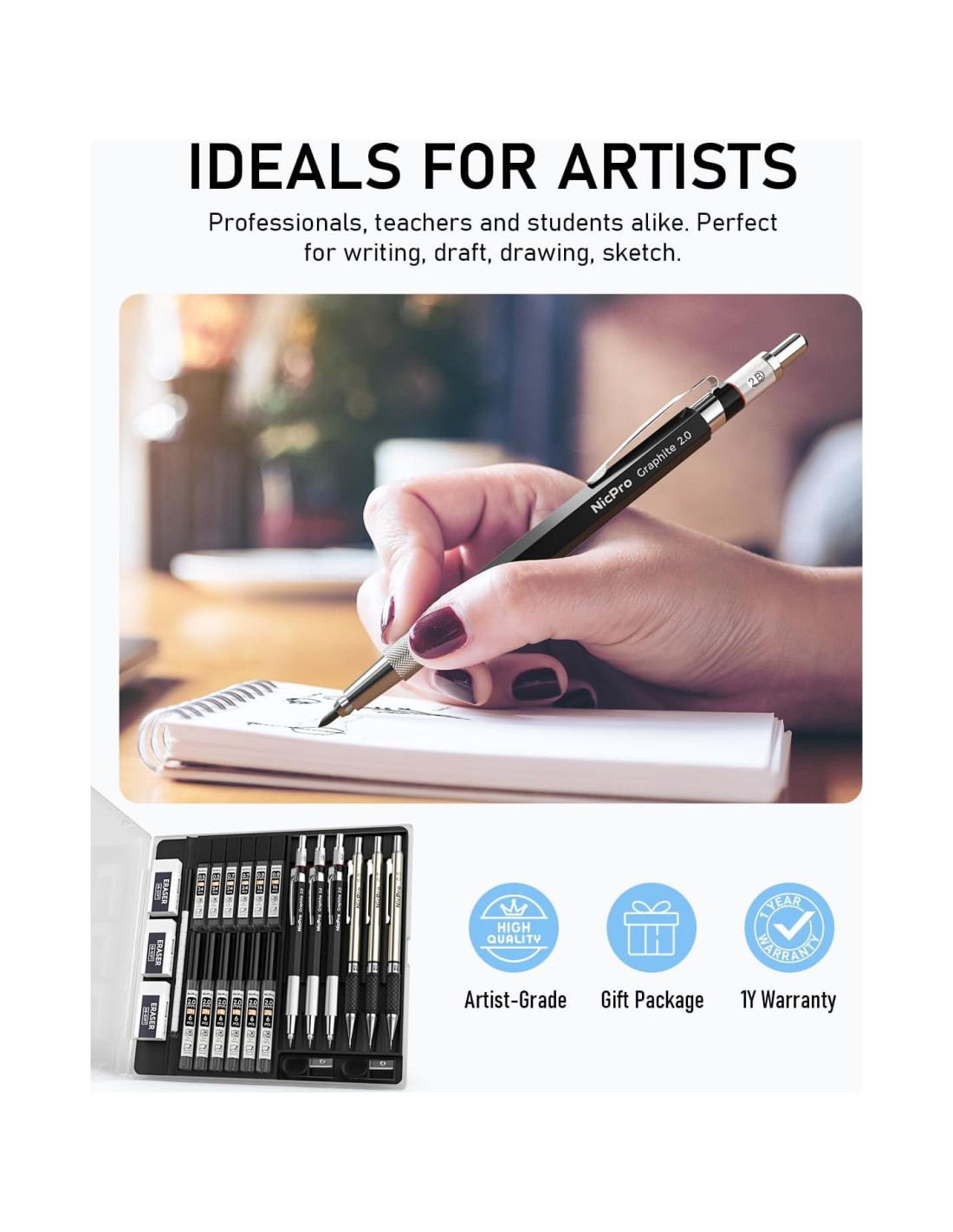 - Paquete de Valor: Viene con 6 lápices mecánicos de dibujo, incluyendo 0.5 mm & 0.7 mm & 0.9 mm y 2 mm, 12 tubos de recarga: 0.5 mm & 0.7 mm & 0.9 mm, 2.0 mm (2B HB 2H), 3 PCS de borradores, 9 PCS de recargas de borrador de tapa, 2 PCS de sacapuntas y un estuche para lápices mecánicos