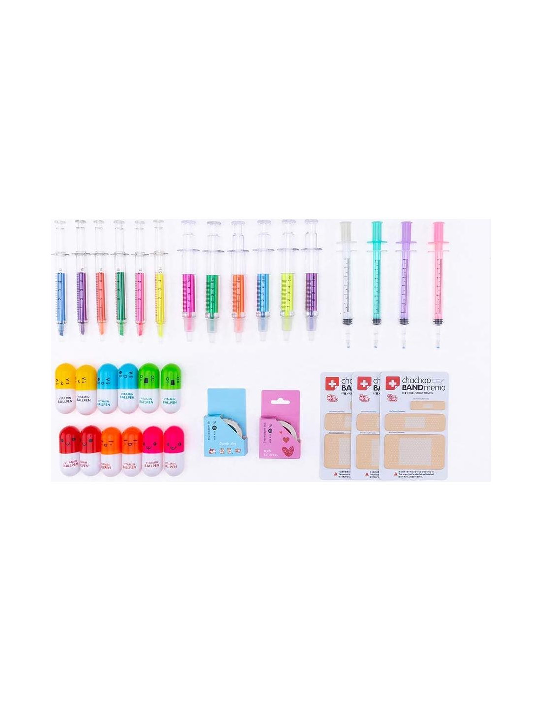 - Lo Que Obtienes: 34 Pcs Conjunto incluye 12 Marcadores Jeringa de Colores Múltiples + 12 Bolígrafos de Pastillas de Vitamina + 4 Bolígrafos Aguja de Enfermería + 3 Notas Adhesivas en Forma de Vendaje + 2 Cinta Washi + 1 Caja de Empaque. Nuestra garantía de devolución de dinero de 45 días y garantía sin preocupaciones de 12 meses y servicio al cliente amigable.