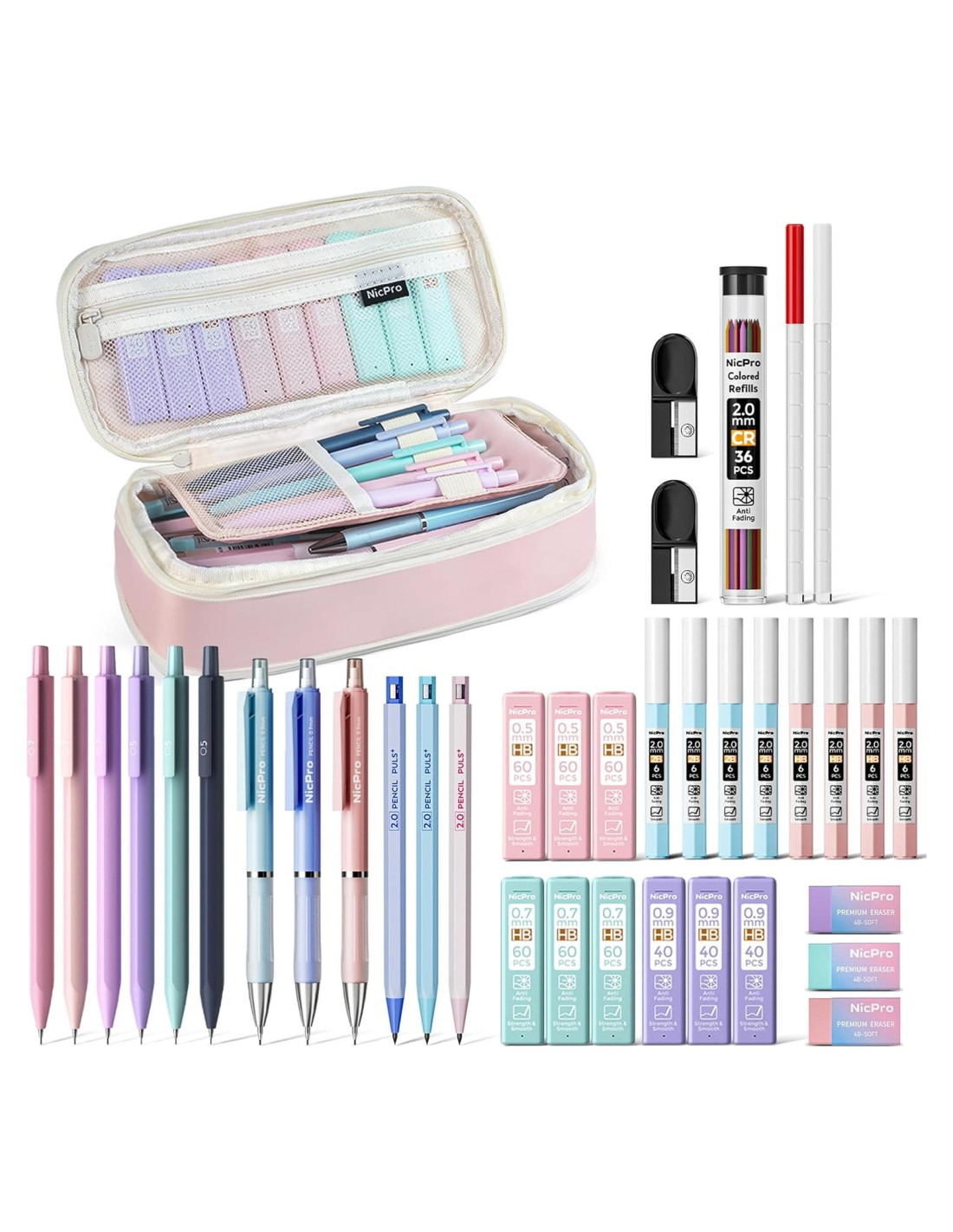 - Suministros Escolares Estéticos - Todo lo que a las Chicas y Estudiantes les Encanta: Este set de lápices mecánicos todo en uno cuenta con 12 lápices de tonos pastel (3x0.5mm, 3x0.7mm, 3x0.9mm, 3x2.0mm con sacapuntas incorporados), 18 tubos de recargas de mina, 3 borradores rosa suave, 18 recargas de borrador de tapa, 2 sacapuntas de mina, y un estuche de lápices rosa plegable. Ya seas estudiante, profesor o amante de la papelería, este kit lindo y funcional añade encanto a tus tareas diarias de escritura o dibujo.