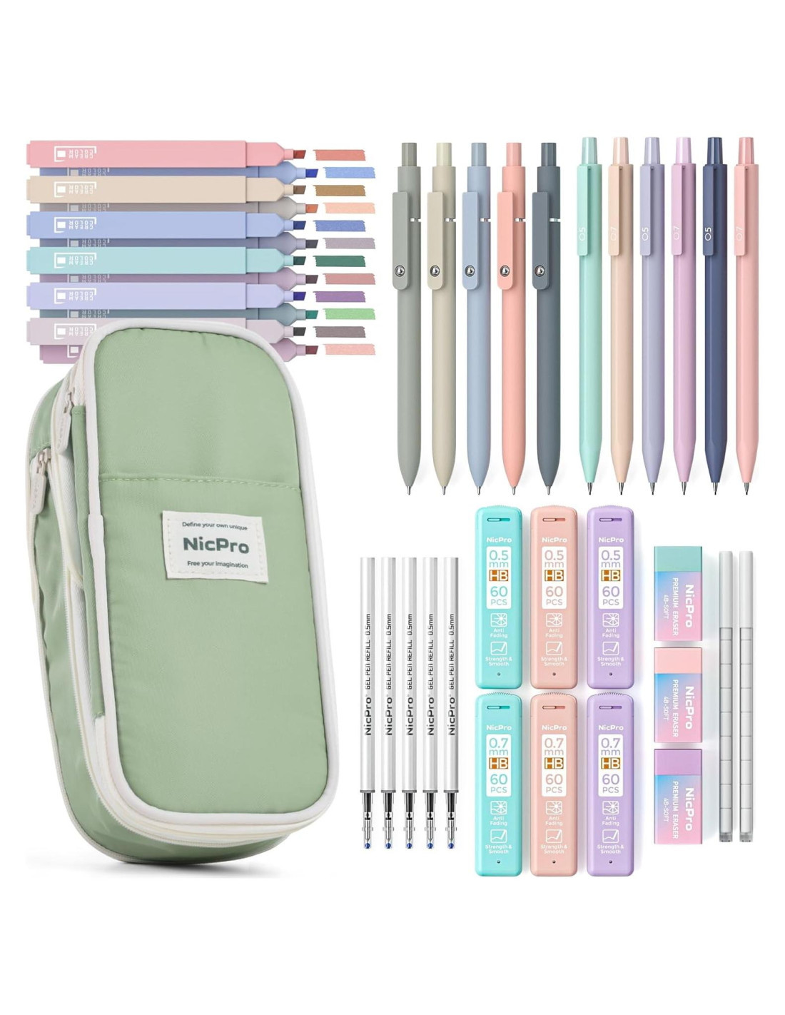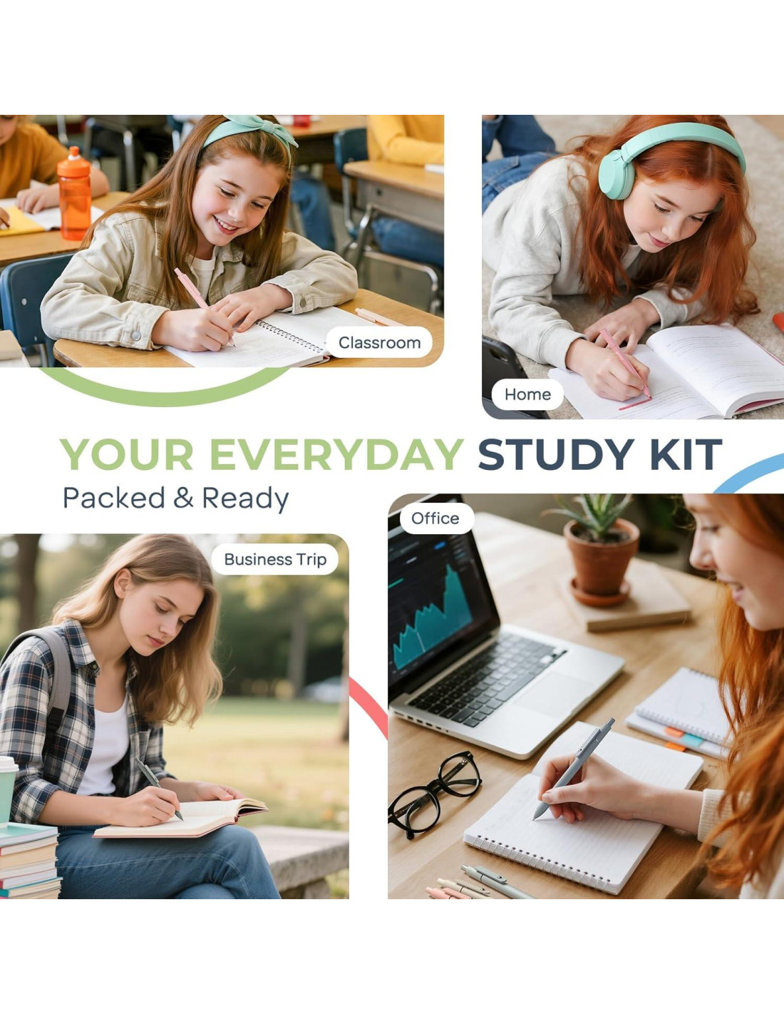 - Conjunto de Papelería Integral: Este paquete incluye todo lo que necesitas para escribir, resaltar y organizar tus materiales de estudio o trabajo. El conjunto de plumas contiene 12 marcadores de colores pastel, 6 lápices mecánicos pastel, 5 plumas de gel de tinta negra con 5 recambios de gel, 3 borradores con 18 recambios de borrador, 6 tubos de recambios de mina de lápiz mecánico, y un estuche de lápiz de tela duradera.
