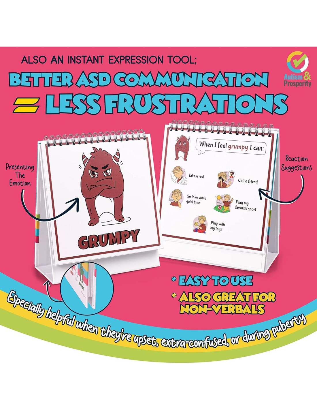 - Mejor comunicación ASD (verbal o no) = menos frustraciones (o incluso crisis) - Simple y fácil de usar, nuestro libro de emociones se duplica como una herramienta de expresión instantánea (especialmente útil cuando está molesto, confundido, durante la pubertad); encontrar y mostrar emociones actuales