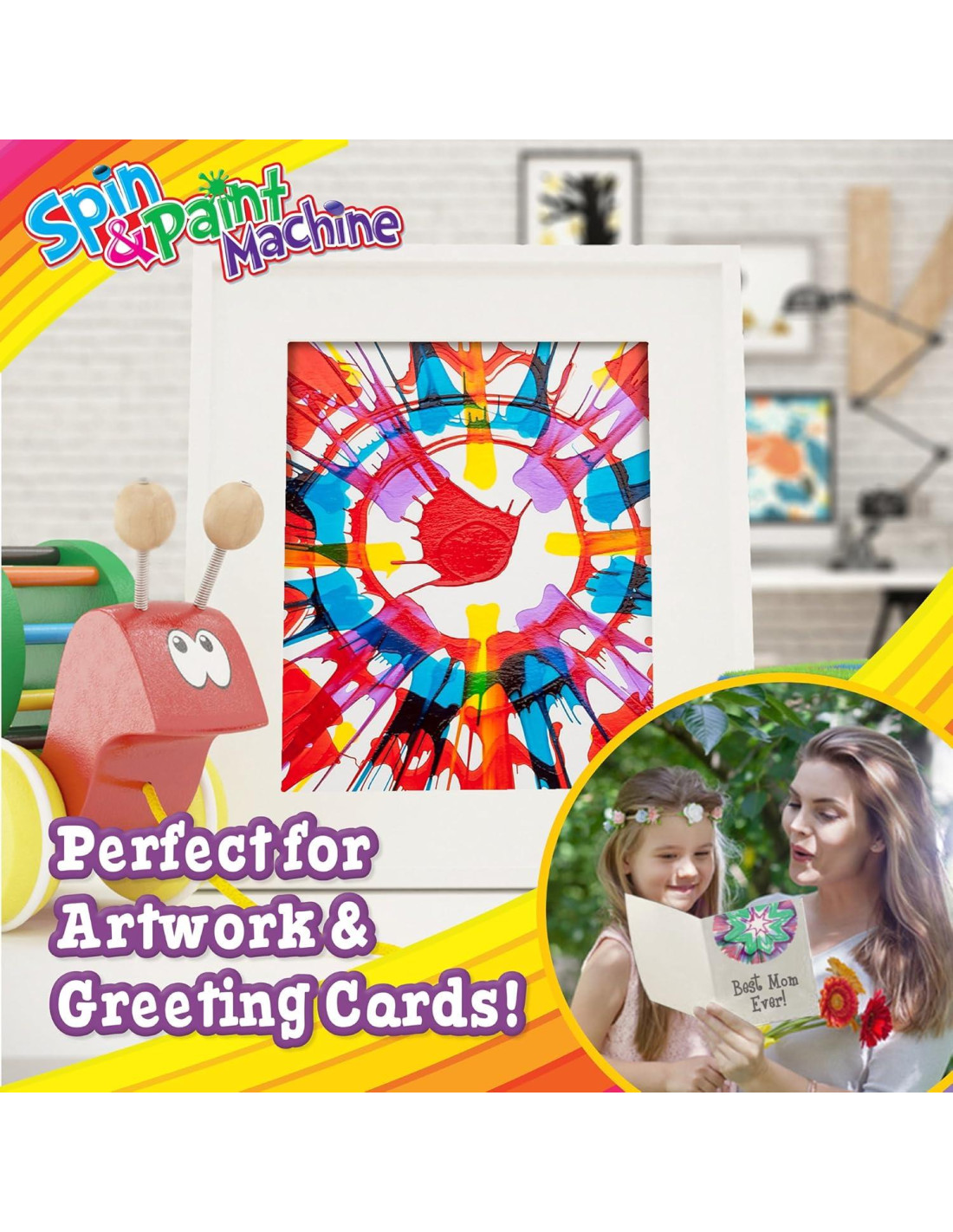 - Kit de Arte Todo Incluido: Crea piezas de arte hipnotizantes y únicas con la máquina de arte giratoria incluida en el kit. El set de arte incluye Máquina de Arte Giratoria, protector contra salpicaduras, 5 botellas de pintura, 4 crayones blancos y 20 tarjetas en varias formas y tamaños.