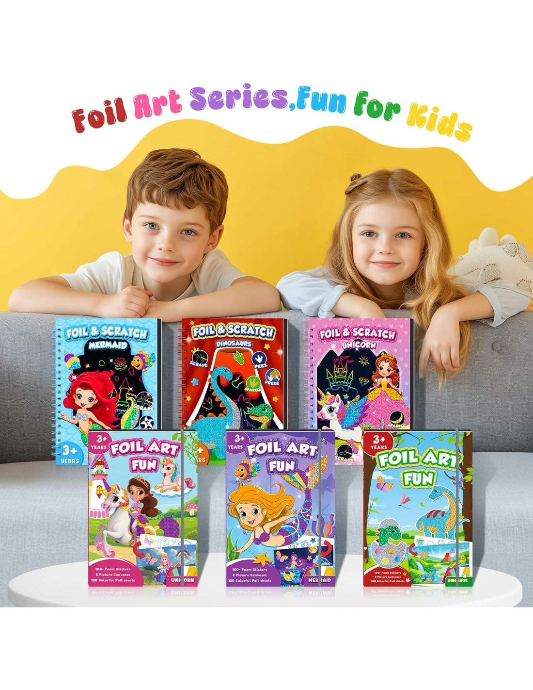 - Actividades de Arte y Manualidades con Foil: El arte con foil incluye 120 hojas de foil coloridas, 8 lienzos para imágenes y más de 100 stickers de espuma, 50 ojos saltones y manual de instrucciones - proporcionando muchas actividades de arte y manualidades sin desorden para que los niños desaten completamente su imaginación. ¡Pueden crear impresionantes obras de arte con dinosaurios, volcanes, insectos, fósiles y más, generando horas de juego creativo!