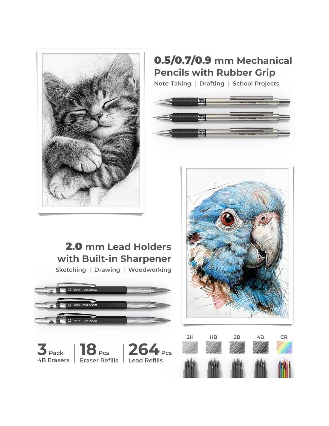 - Juego de Lápices Mecánicos Profesionales para Dibujo y Diseño: Ideal para trabajo artístico, bocetos y arquitectura, este juego incluye 6 lápices de metal (0.5mm para detalles finos, 0.7mm versátil, 0.9mm para sombreado suave, y 3x2.0mm portaminas para trazos gruesos); Viene con 228 recargas de mina (2H/HB/2B/4B), 36 minas de colores de bonificación y juego de borradores; El agarre ergonómico asegura un control sin deslizamiento para un diseño preciso y trabajo creativo