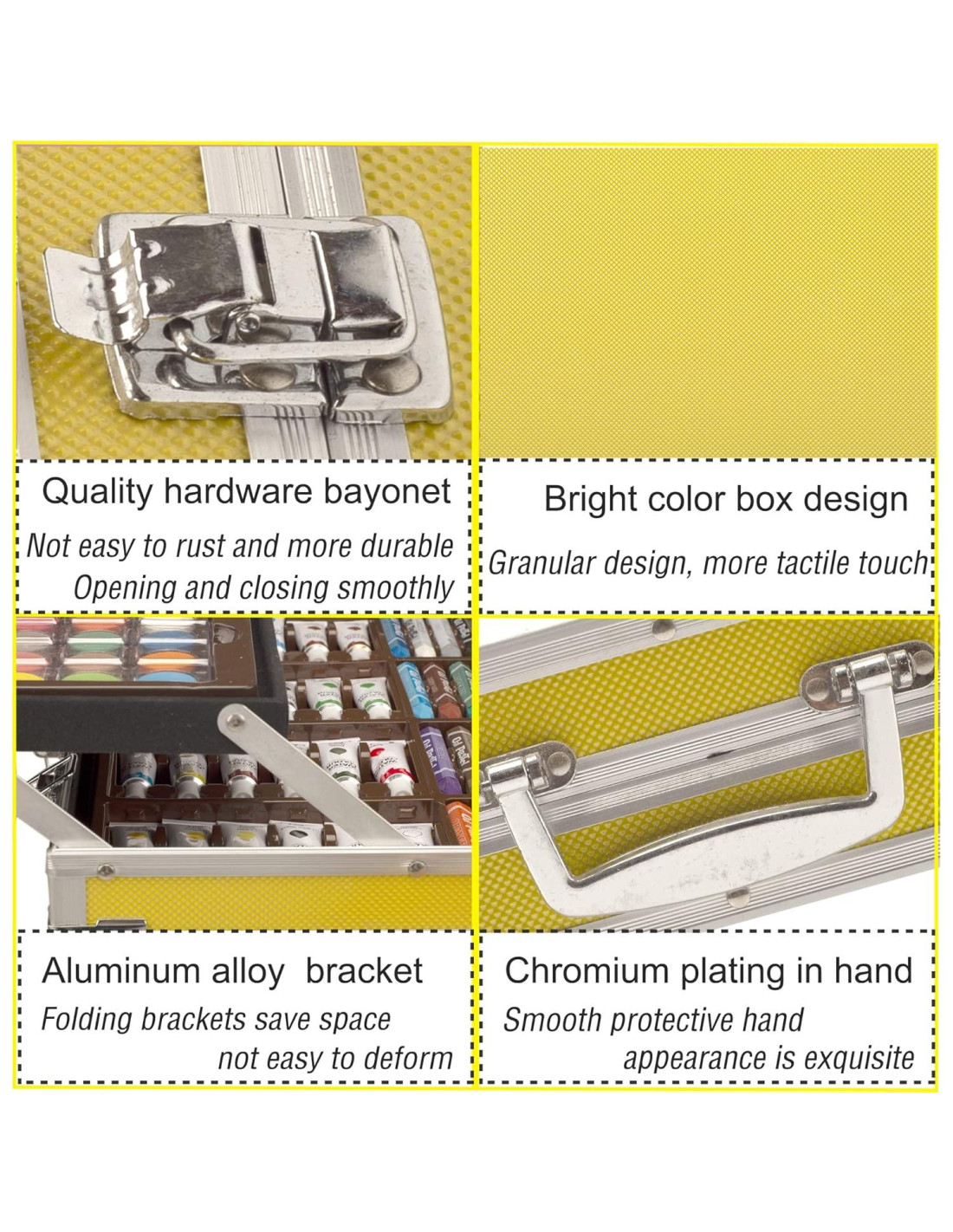 - Caja de Regalo: Viene en un maletín de aluminio deluxe con dos capas y muchos suministros de arte coloridos para inspirar la creatividad.